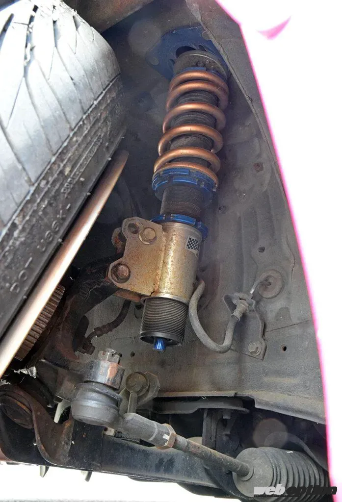 一方のリヤサスは、マルチリンク式なのでアッパーアーム短縮かロアアーム延長でネガティブキャンバー角を稼ぐのがセオリーだが、意外にもロアアームは純正のまま。その代わりに、調整式のピロアッパーアームを使い、ターンバックルを外して限界まで短縮する工夫のおかげで、16度まで寝かせることに成功した。