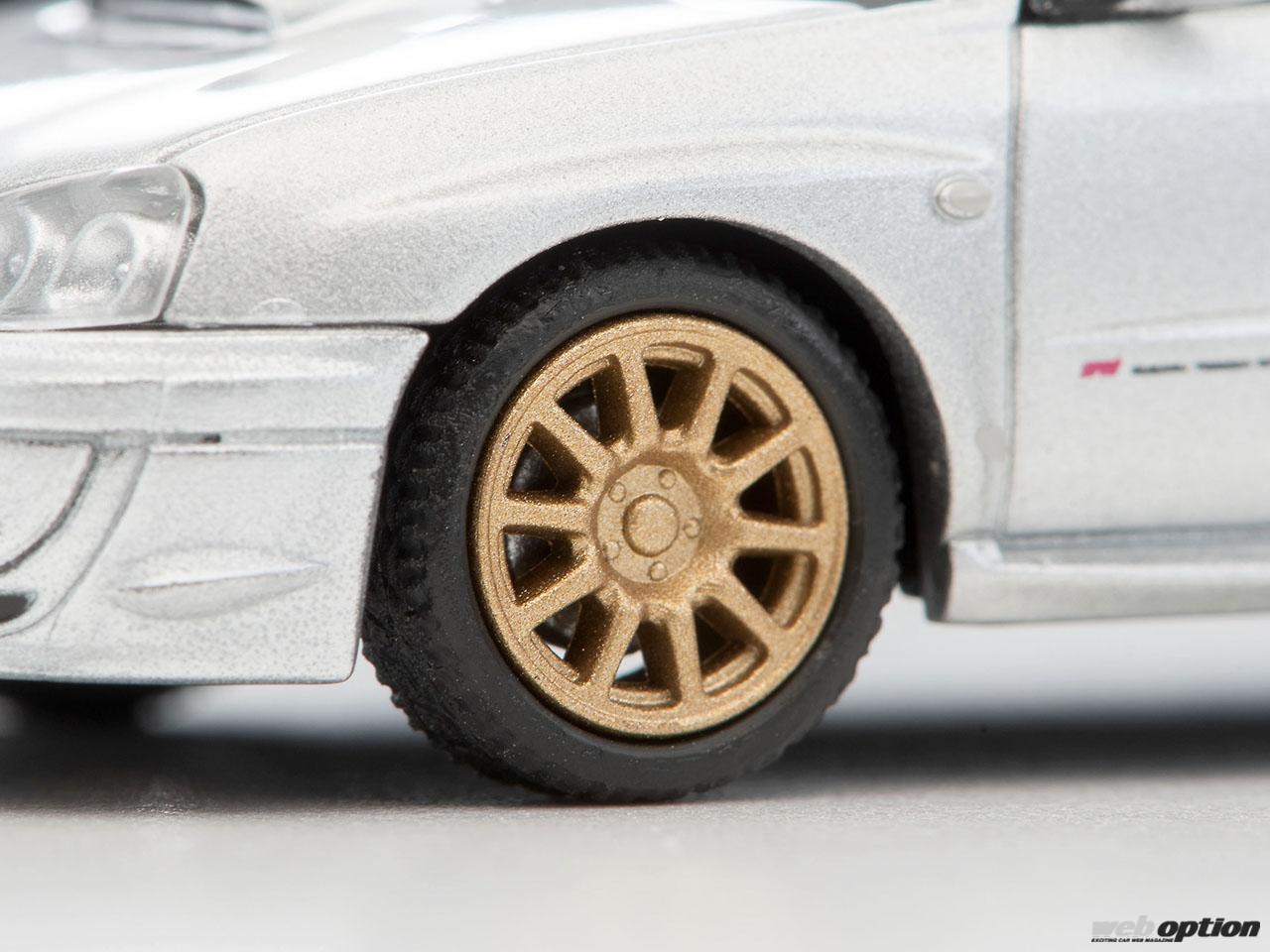 これまでもGDB型WRX STIは製品化されていたが、今回登場するのは純正オプションの鍛造ホイールを装着した仕様。ボディカラーも定番のWRブルーではなく、シックなシルバーとなっている。