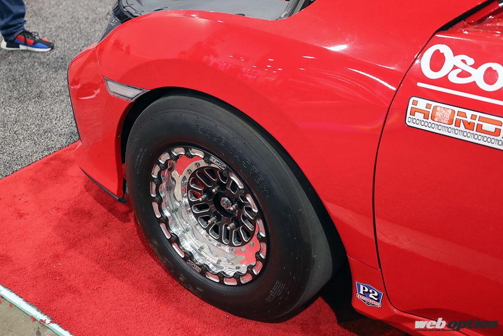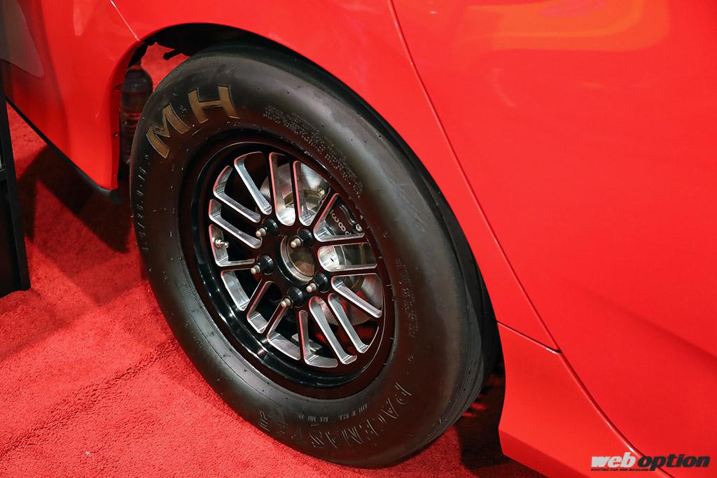 タイヤチョイスもFFドラッグマシンならではで、フロントにM&Hの15インチドラッグスリック、リヤに走行抵抗の少ないフロントランナーを装着。蹴り足よりも掻き手が強化されたこの独特のフォルムは、FFドラッガーならではの異形のカッコ良さだ。