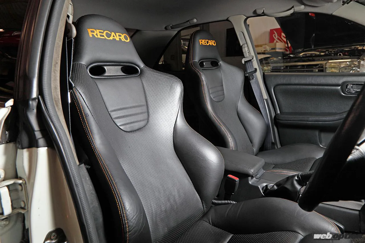 運転席、助手席ともにレカロのスポーツJCに交換。ホールド性の向上という機能面のメリットだけでなく、デザインやレザー表皮などもローレルの車格に相応しく、ルックス面でも好マッチングを見せている。