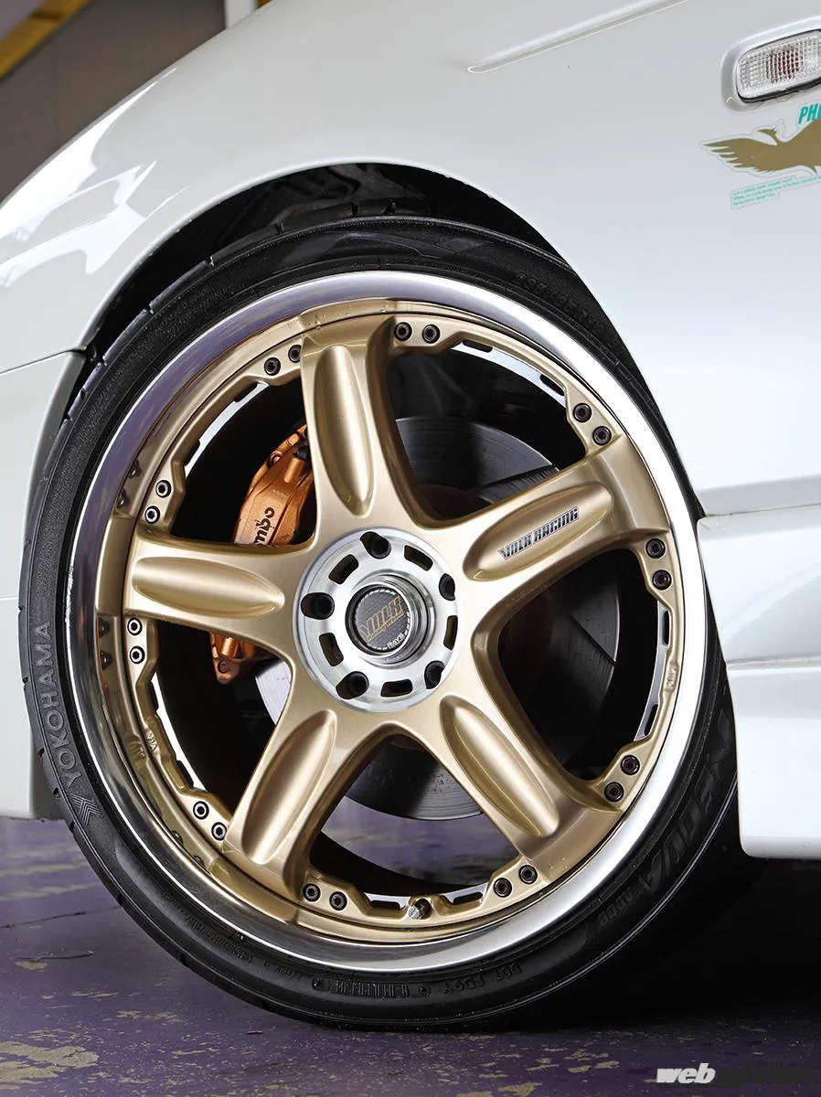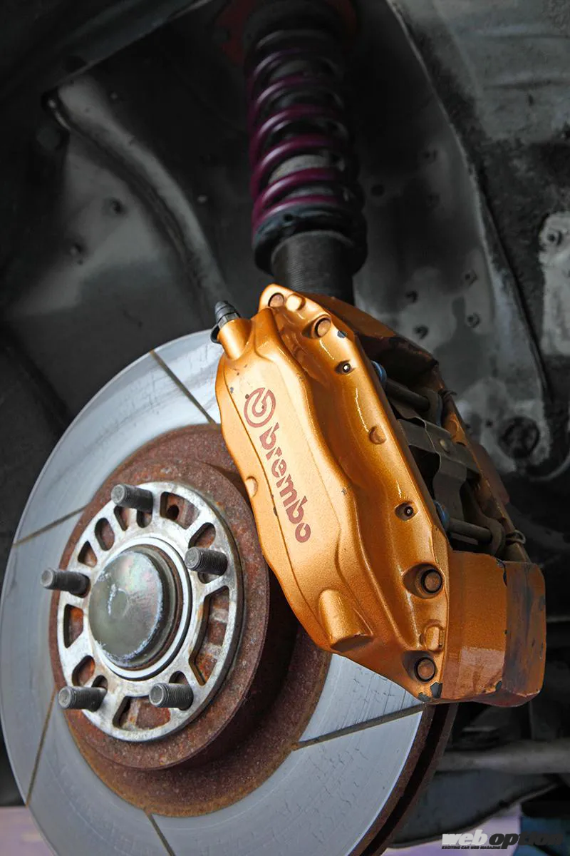 サスペンションはアラゴスタベースの特注車高調でセットアップ。大パワーを受け止めるべく、ブレーキは前後ともBNR34用ブレンボを流用して強化済みだ。