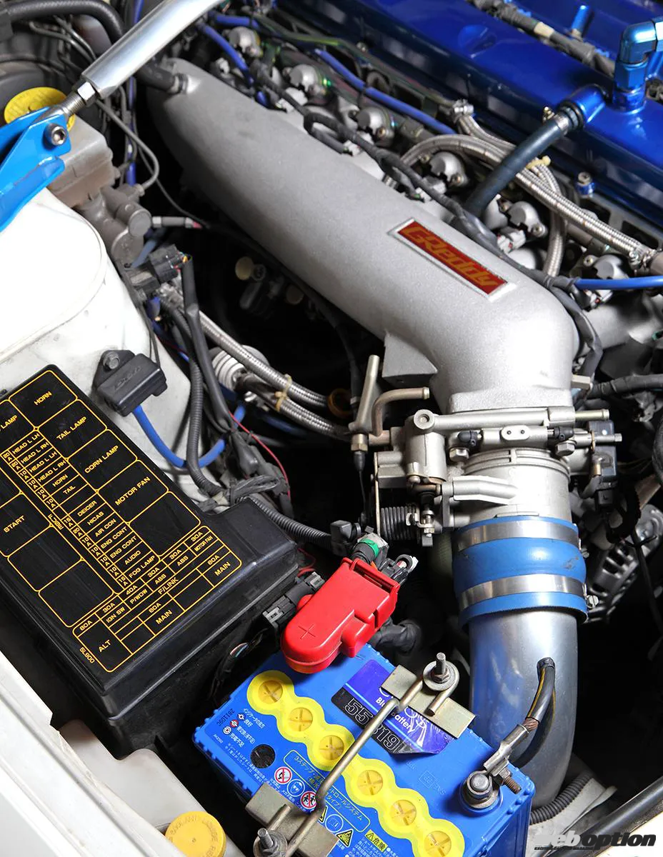 サージタンクはトラストの大容量タイプで、スロットルには定番のインフィニティQ45の100φを流用する。バッテリーはパナソニックの小型大容量のハイクラスモデル“CAOS”。安定した電源供給はエンジン性能を引き出すことにも貢献してくれる。