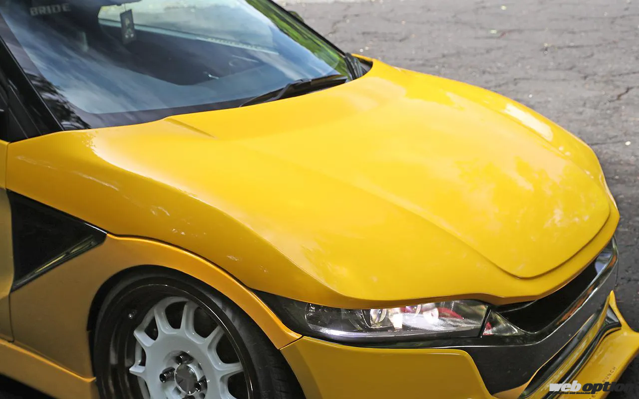 ボンネットはヘッドライト&グリルまで被さるバットフェイス仕様とし、S660のシャープな印象をより引き立てる。前方向への延長幅は50mmだ。ワイパーブレードを隠すボンネットスポイラーもスムージングしてインストールされる。