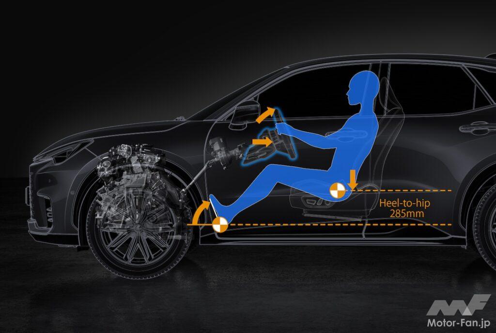 カッコイイスタイルを実現するため、LBXは225/55R18とヤリスクロス(215/50R18)やレクサスUX(225/50R18)よりも外径の大きなタイヤを履く。そのため、前車軸を前に22mmずらした。カタログ諸元値でホイールベースがヤリスクロス比で20mm伸びているのはそのためだ。ダイヤを大きくするとフロントバルクヘッドやロッカー(サイドシル)と干渉するため、タイヤを前に出す選択をした。