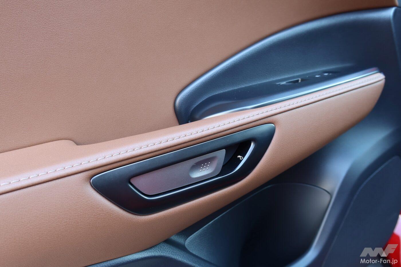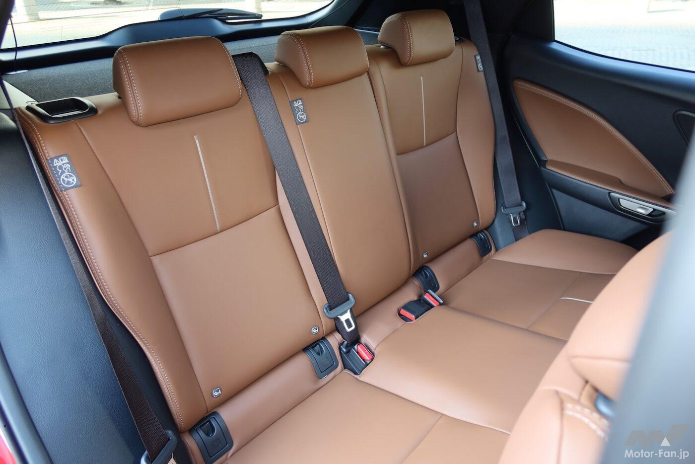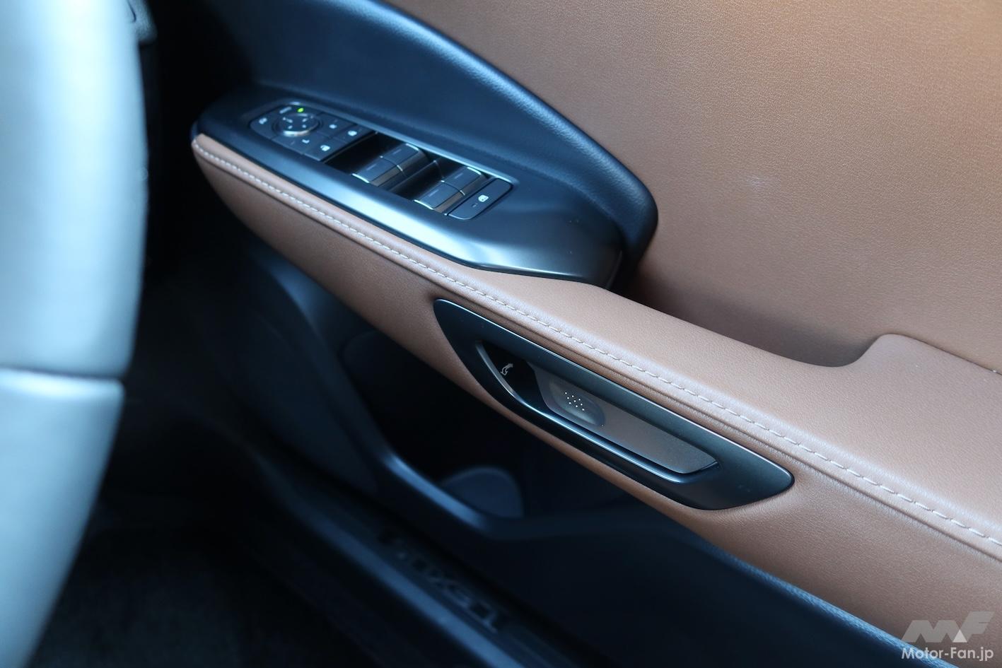 リヤフェンダーの膨らみはクルマをグラマラスに見せているし、筋肉質だ。絶対的なサイズは小さいが、存在感はあり堂々としている。上質なのは見た目だけではなく、ドアを開け閉めする度に感じられる。2021年のNXからレクサスで採用が始まった電動ラッチ(e-ラッチシステム)を採用しており、内も外もハンドルに指を当てて軽く押せば電動でロックが解除される。