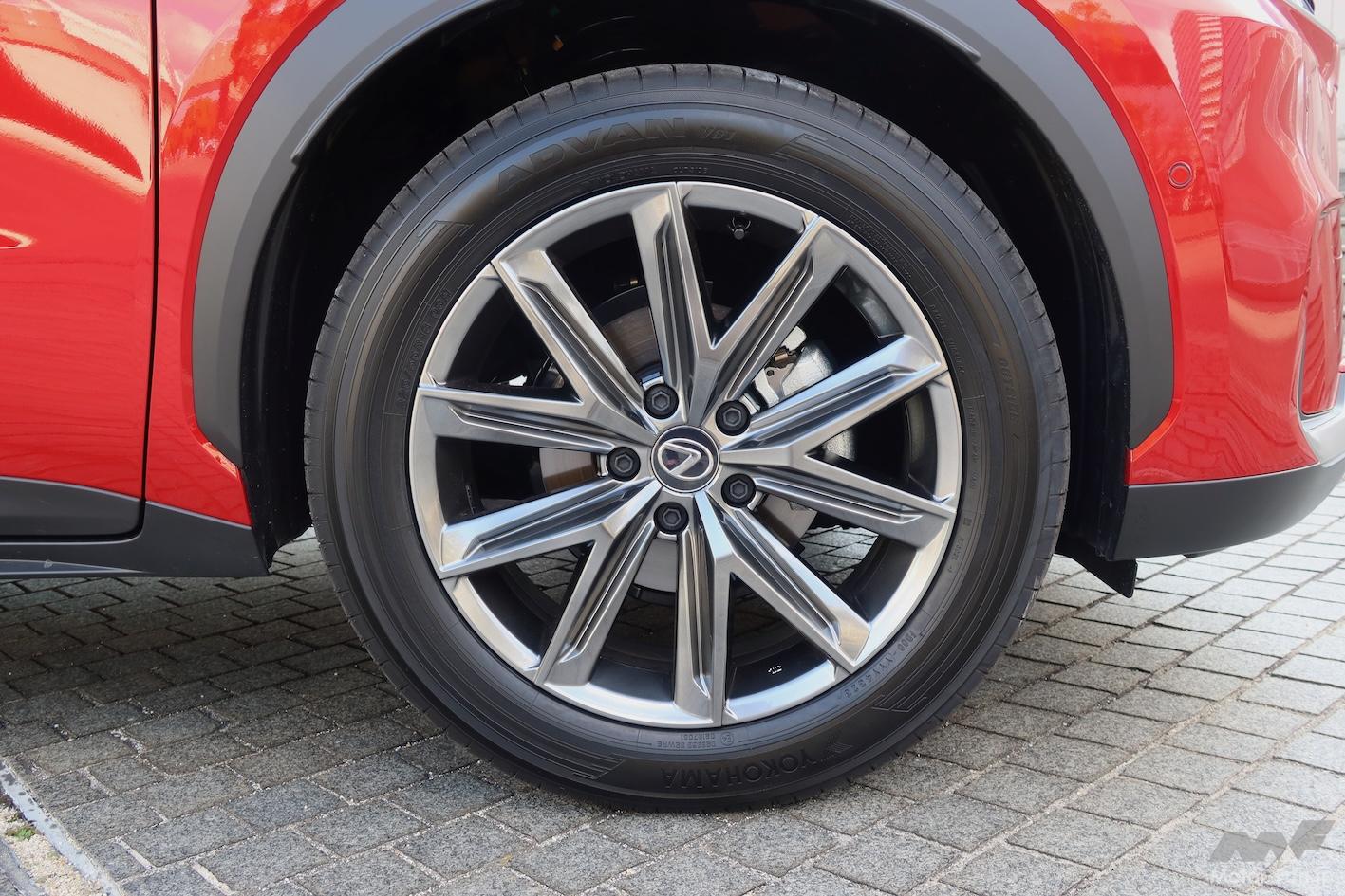 カッコイイスタイルを実現するため、LBXは225/55R18とヤリスクロス(215/50R18)やレクサスUX(225/50R18)よりも外径の大きなタイヤを履く。そのため、前車軸を前に22mmずらした。カタログ諸元値でホイールベースがヤリスクロス比で20mm伸びているのはそのためだ。ダイヤを大きくするとフロントバルクヘッドやロッカー(サイドシル)と干渉するため、タイヤを前に出す選択をした。