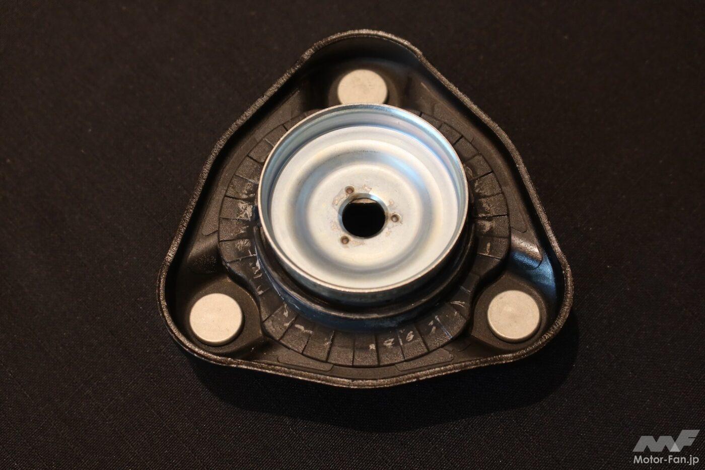 ダンパー(ショックアブソーバー)とコイルスプリングの入力を受け止めるアッパーサポートは1点締結から3点締結に変更した。どこかで聞いた覚えがある変更だが、そう、進化型GRヤリスが適用したのと同じ技術である。レクサスLBXの世界初公開は2023年6月5日なので、世に出たのはこちらが先。開発もLBXが先だったという。
