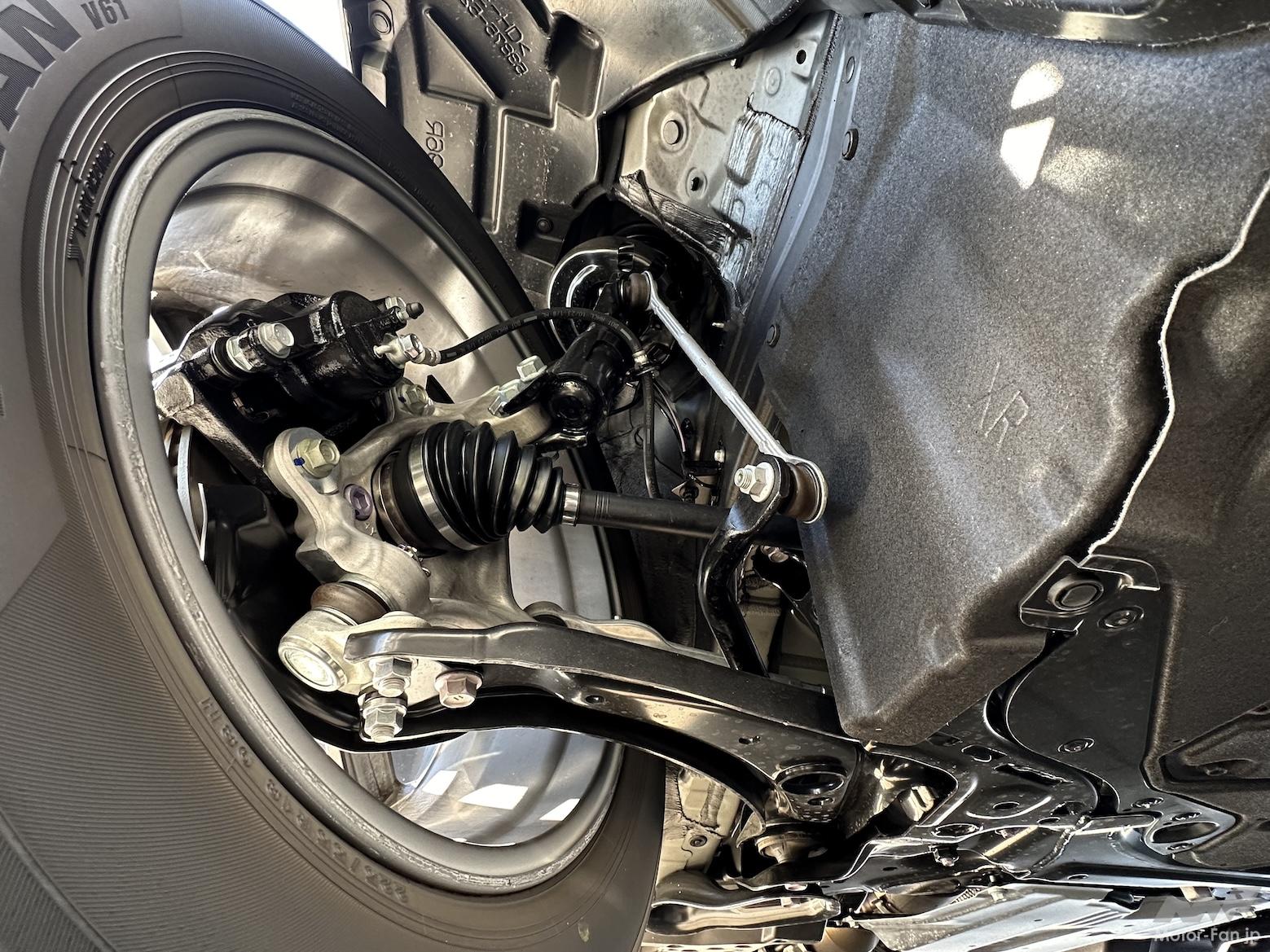 ストラット式フロントサスペンションのアッパーサポートの位置を変えると生産工程面で大仕事を強いられるので、位置は変えられない(変えたくない)。となると、前車軸が前に移動したぶん必然的にキャスター角は強くなるが、もともと外乱に強くしたい思いがあったので好都合だったという。結果、キャスタートレールが大きくなって転舵するのに大きな力が必要になる。そこはコラムEPSの容量を拡大して対処した。