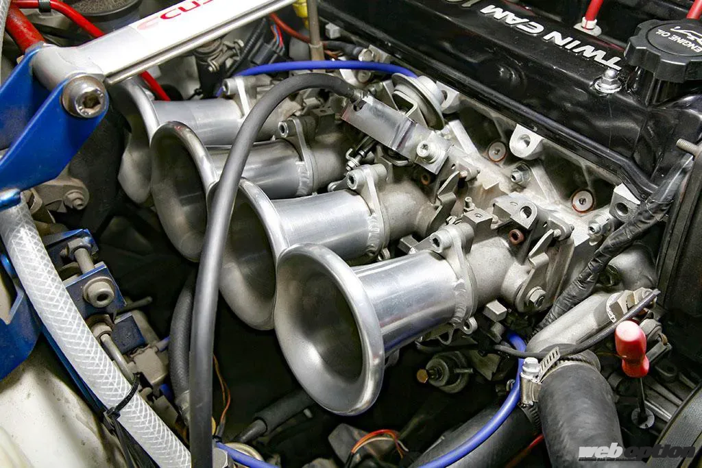 吸気系には、AE101のスロットルボディを流用して4連スロットル化を実施。インマニとEXマニはテックアート製だ。その他、MSD6 AL+コイルにより点火系を強化し、パワーFCで燃調や点火時期のセッティングを行なっている。