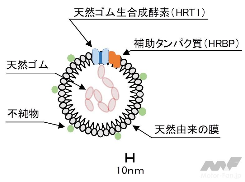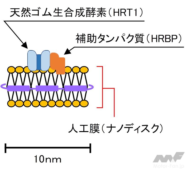 「HRT1」はこれまで、ゴム粒子膜や酵母膜など天然由来の膜上でイソプレン鎖を生合成することは確認できていた。しかしながら、天然由来の膜を使用するため不純物の混入が課題となっていた。そこで、天然由来の材料を使わない人工膜(ナノディスク)を利用した酵素評価方法の開発を行ってきた。