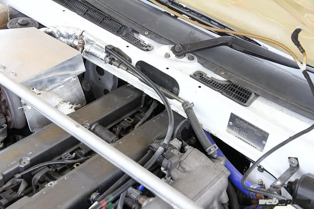 なお、エンジン本体は15cmほどバルクヘッド側に寄せて搭載。重量バランスを考慮すると同時に、エンジンルーム前方のスペースを確保した。ミッションにはJZA70純正AT(A340E)をチョイス。このミッションを換装するためにフロアトンネルも拡げられている。