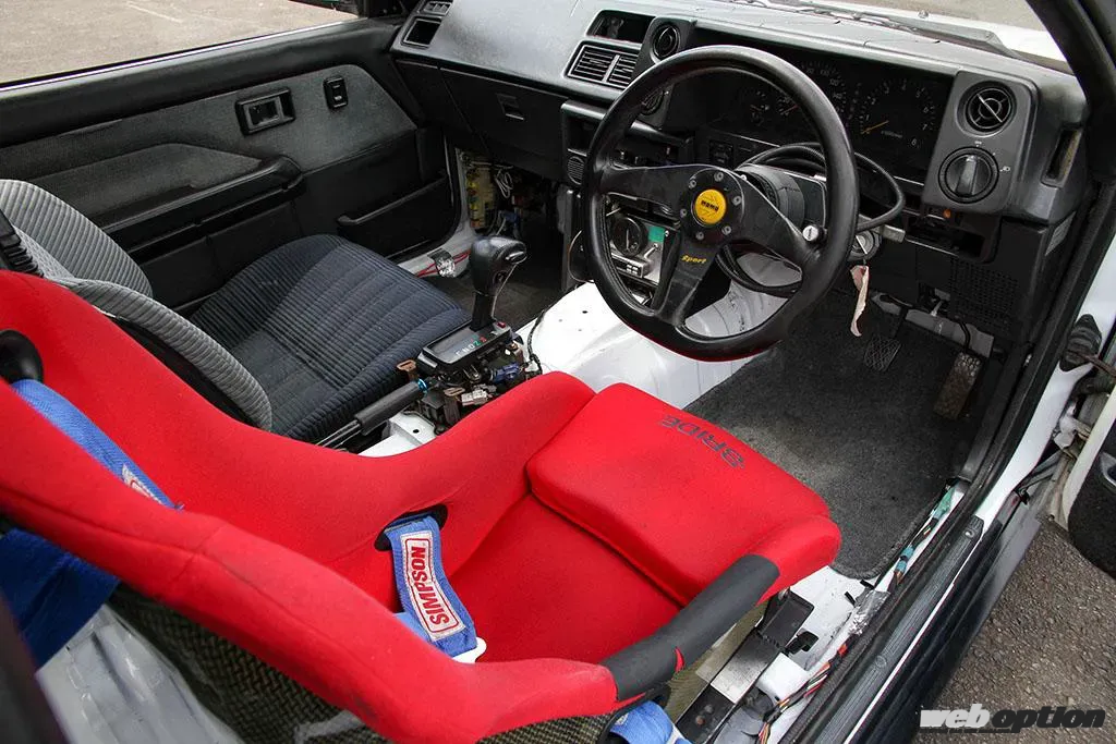 アンダーコートなどは剥がされているものの、インテリアは非常にシンプルなメイキングだ。ドライバーズシートはホードル性が高いブリッドのジータIII、レーシングハーネスはシンプソンを奢る。