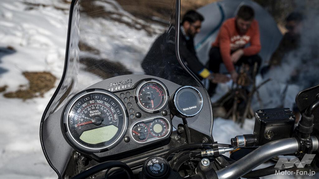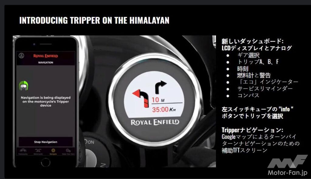 2:手持ちのスマホのグーグルマップ+独自のアプリを用い、ヒマラヤに装備された専用ナビゲーションシステムに表示する「Tripper(トリッパ―)」を標準装備。スマートフォンにロイヤルエンフィールドのアプリをインストールし、バイクをペアリングするだけで使⽤可能