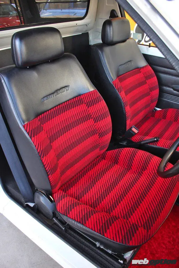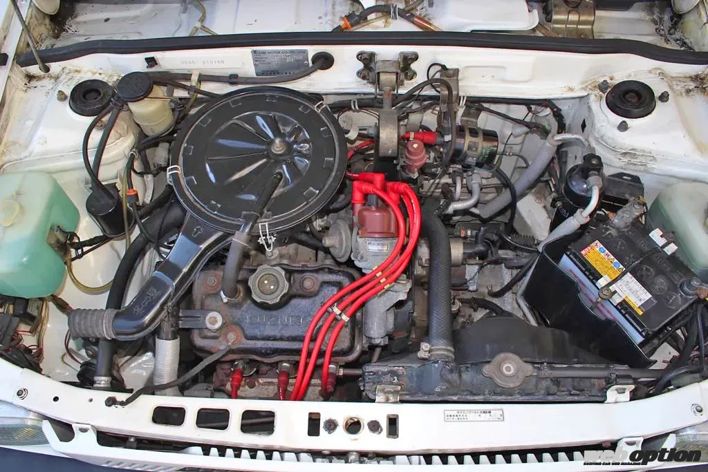 ボンネットの下に収まるのは、550ccのF5A型。1978年、フロンテに初めて搭載されたエンジンだ。同じエンジン型式で、2バルブSOHCインタークーラーなしターボ(キャブ)/同インタークーラー付きターボ(EPI)、3バルブSOHCスーパーチャージャー、4バルブDOHC/同インタークーラー付きターボと多くの仕様が存在した。