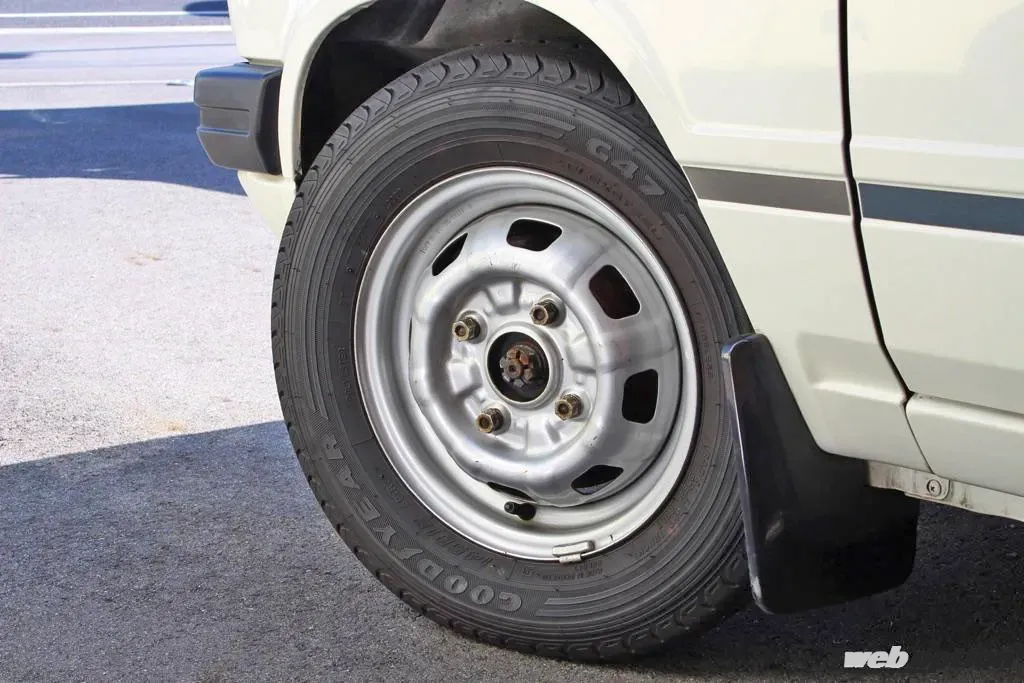 純正鉄ホイールはトピー製で、リム幅は「そんなのあるのね…」と思うこと確実な3.5J。そこに組み合わされるのは、純正と同じ145R12サイズのグッドイヤーG47だ。