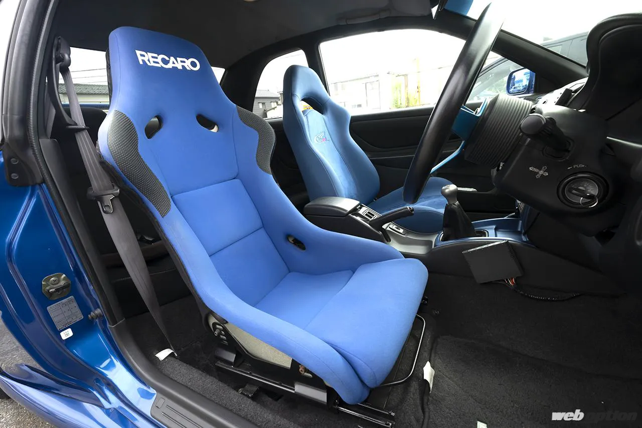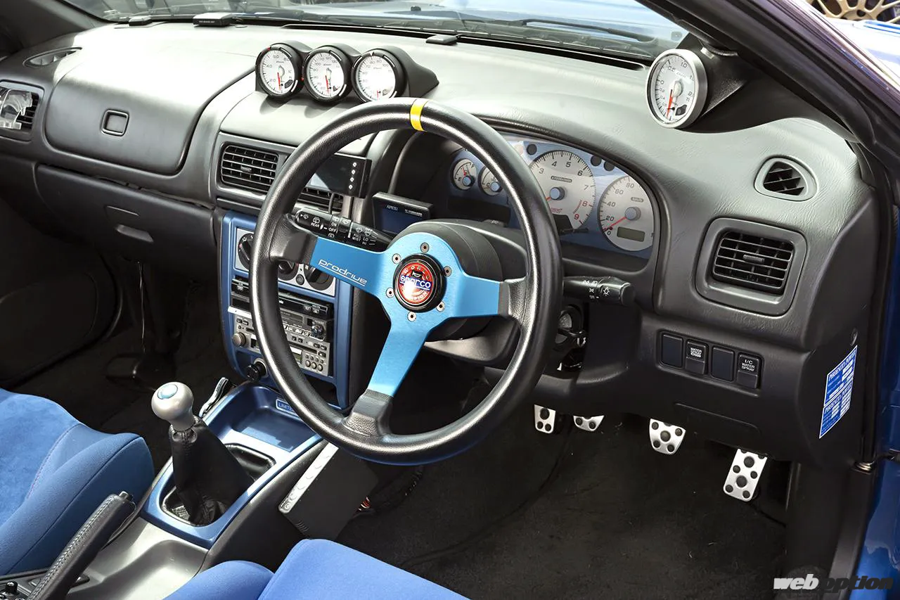 インテリアはブルー基調の純正をブラッシュアップするように、ステアリングやシートをコーディネイト。コンディション管理を徹底するため、視認性の良いダッシュボード上やAピラーに追加メーターを設置する。