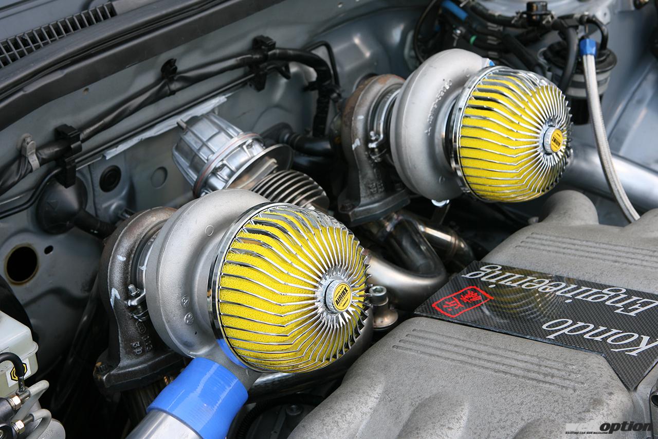 ベースエンジンを徹底的に鍛えた上で、トラストのTD05-18G(6cm2)タービンをバルクヘッド側にツインで配置。これは“パワフルかつマイルドに扱えるウエストゲート式タービン”という条件でのセレクトだ。エンジンルームのインパクトも抜群だ。