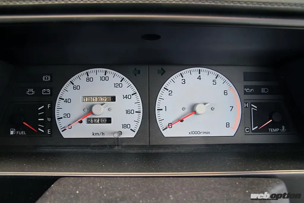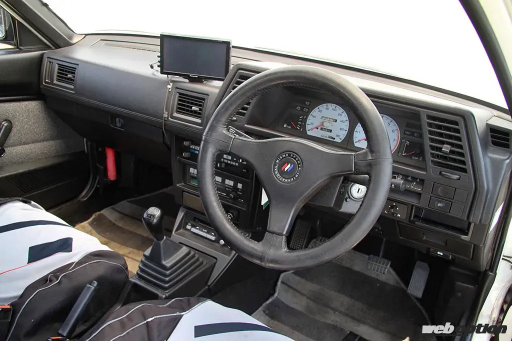 直線基調のダッシュボードデザインに絶壁インパネが80年代の日産車の特徴。運転席に座ってまず感じるのは、ガラスエリアが広く開放的な室内と、1640mmという全幅の狭さ。5ナンバー枠いっぱいから60mmほどタイトなだけだが、乗って感じるコンパクトさは、その数値以上のものがあったりする。