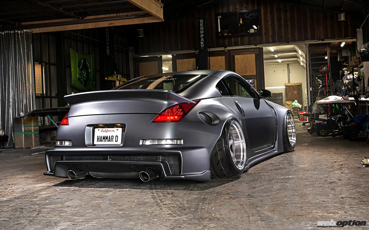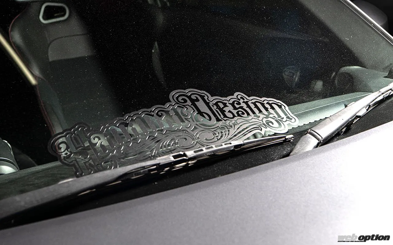 そんなセオリーを見事に証明するのが、“TERU”さんのZ33。強烈なワイドフォルムはロケットバニーのエアロボディキットをベースにしているものの、製品部分は天面の一部を使用するのみ。その他全てをフルスクラッチすることで滑らか過ぎる曲線美を描いているのだ。