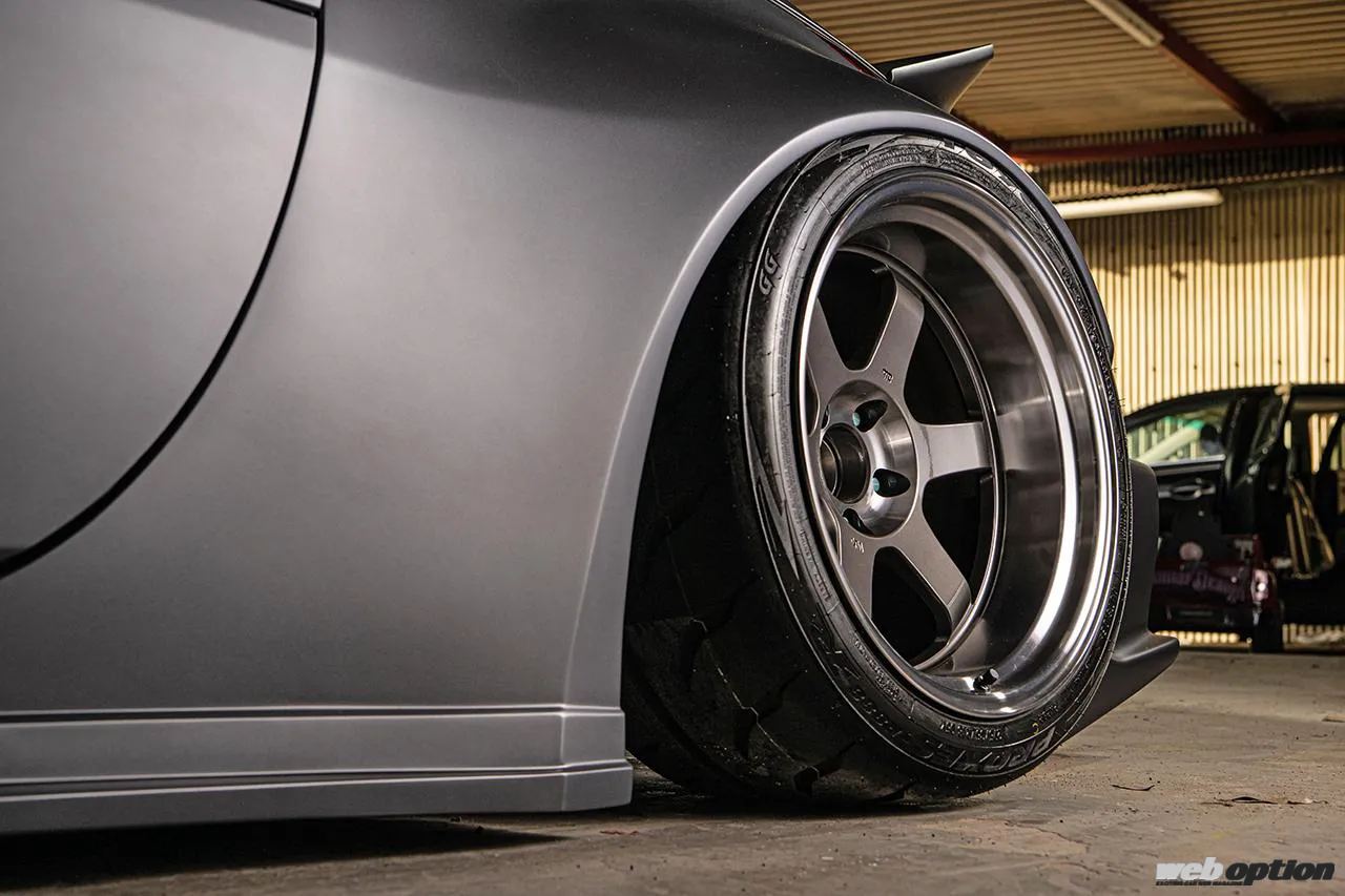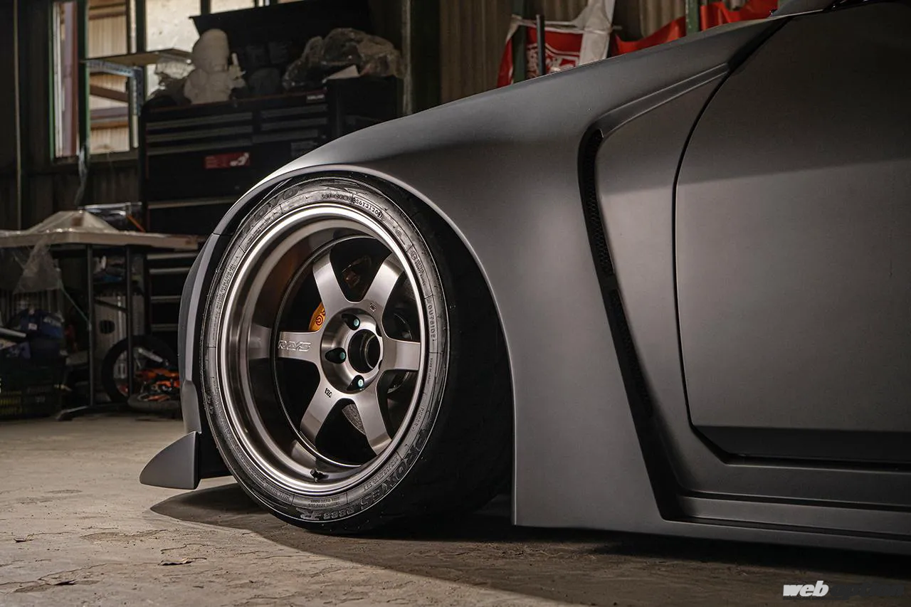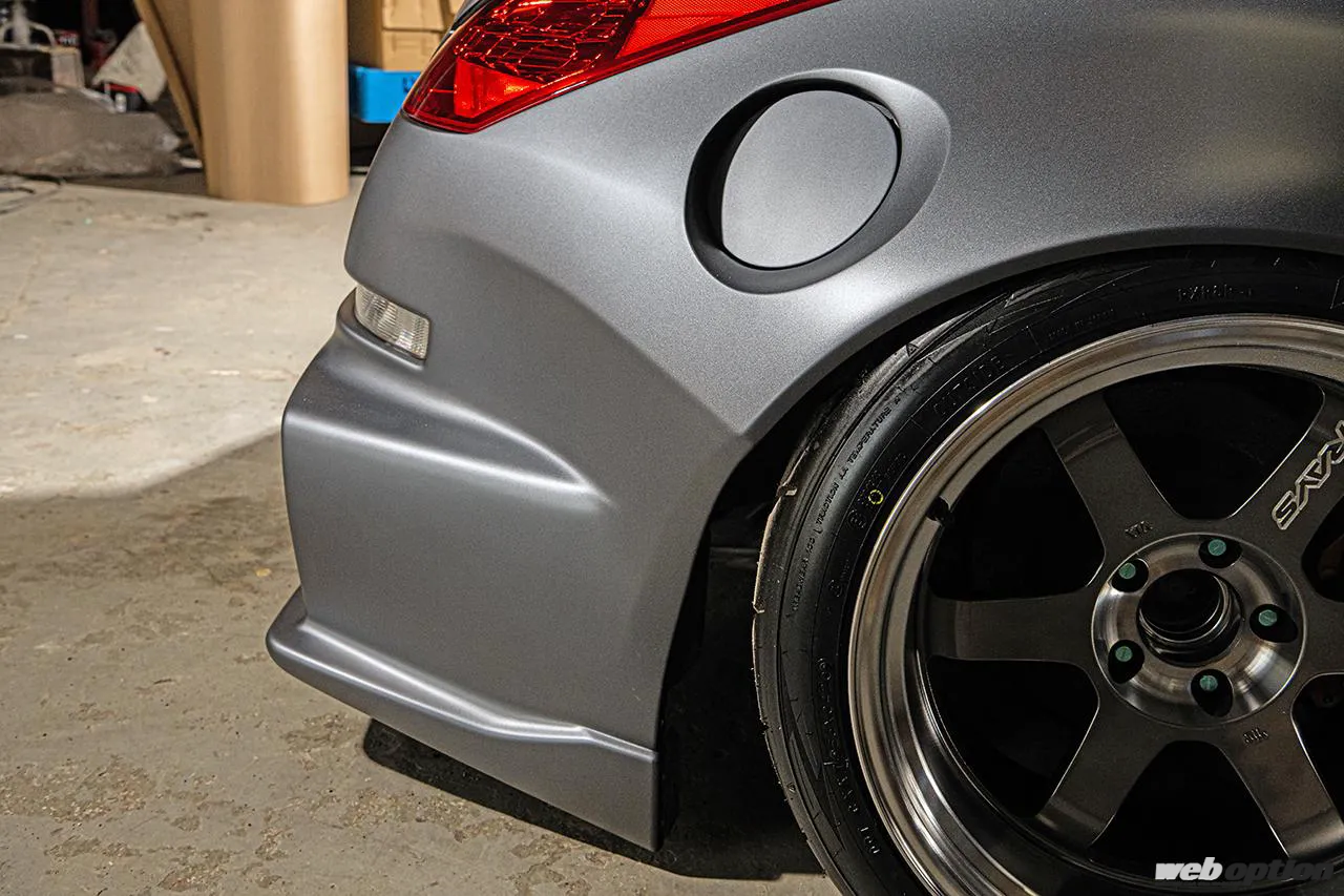 リヤフェンダーもほぼフルスクラッチ状態。天面部分こそロケットバニーながら、裾野部分などはボディに合わせて完全なワンオフ。このフェンダーに合わせるホイールは、「Zならレイズ」のイメージでボルクレーシングTE37Vをフロント10.5J、リヤ11Jでセット。