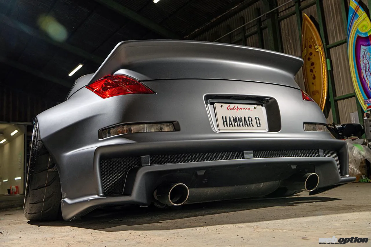 また、スタリングの美しさを重視するあまり、脱着を行わない前提でフェンダーからニスモリヤバンパーを一体化。とくにZ33はローダウン時にリヤバンパー取り付け位置が干渉する問題もあったため、その対策としても効果的だった。