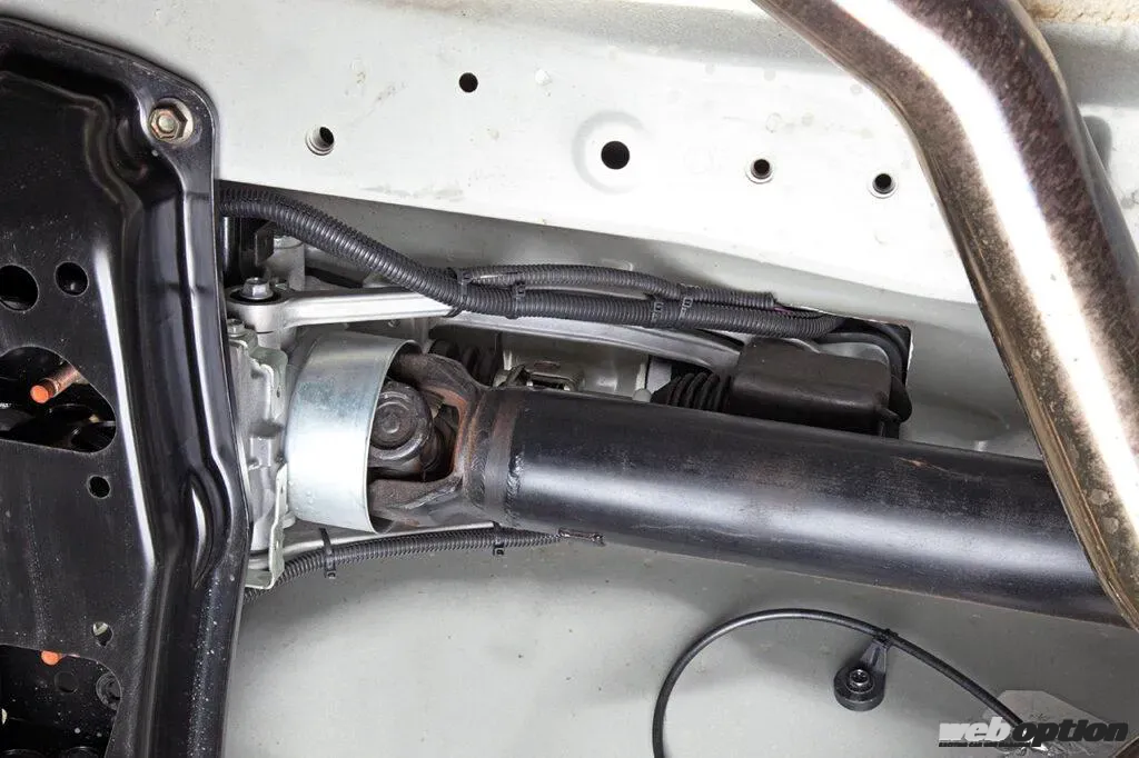 6速MT化にあたって、プロペラシャフトには長さを合わせるための加工を実施。さらに、ミッションとプロペラシャフト結合部の上に位置するフロアパネルは、シフトノブが突き出す箇所のカットも行っている。