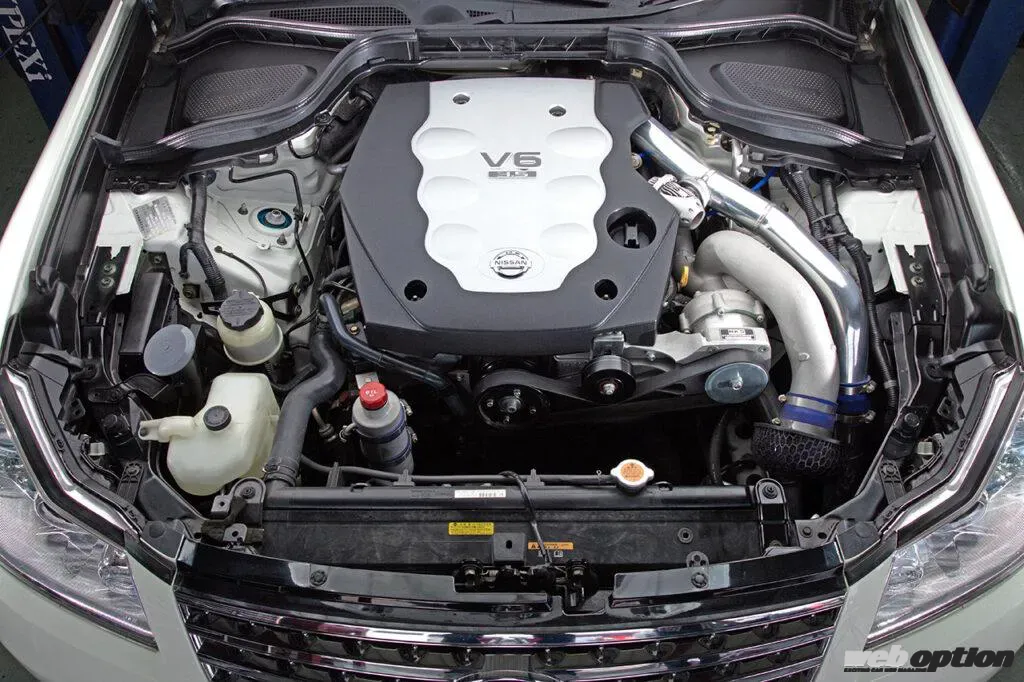 珍しいY50型フーガ(前期型)の本格チュードだ。Z33やV35と同じVQ35DEエンジン搭載グレードを購入したオーナーは、パワー不足を感じて気鋭ショップ“カーメイキングレヴュー”にスーパーチャージャーの装着を依頼。そこから少しずつチューニングを進めていき、ついに6速MT仕様まで辿り着いたという。細部を見ていく。