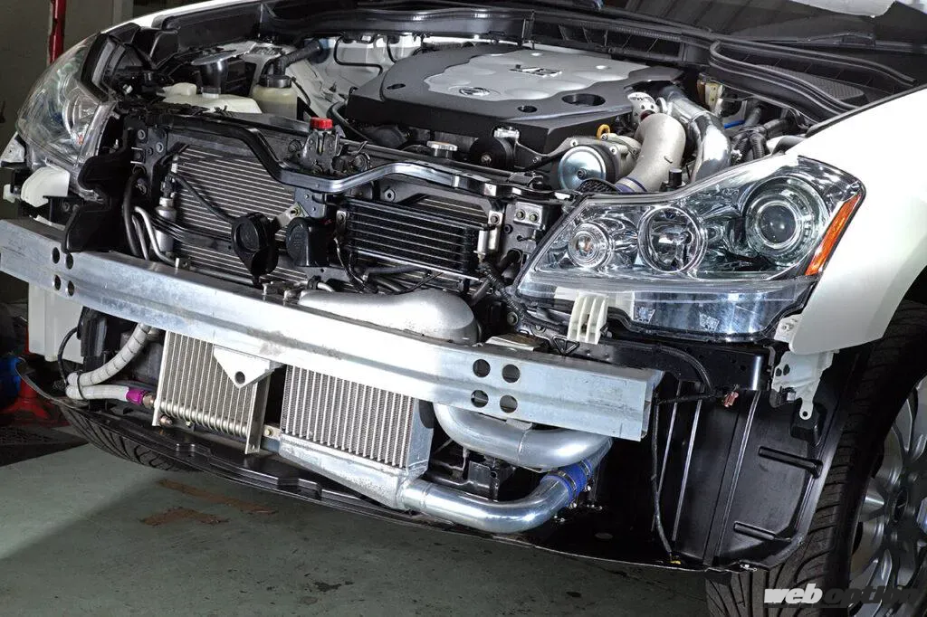 フロントラジエター前には、エンジンオイルクーラーとインタークーラーが並ぶ。なお、インタークーラーはZ33用キットのコアを使い、ワンオフのパイピングで美しくレイアウトしている。