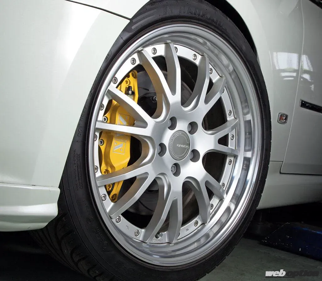 足回りはIDEALトゥルーヴァ(F9kg/mm R7kg/mm)を軸にセットアップ。ブレーキはXYZレーシングのシステムをフロントに奢り、リヤはV36用のキャリパー&ローターを流用。ドレッシーなホイールはワークグノーシスGS4(F8.5J R9.5J)、タイヤはナンカンNS-2(F245/40-20 R275/35-20)をセットする。