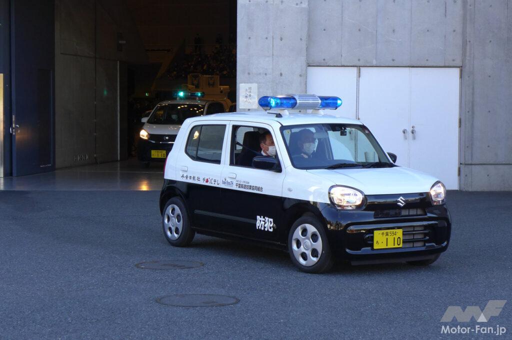車両部隊のトリを務めるのが、千葉市各区の防犯パトロールカーで、こちらは青いパトライトをルーフに載せた軽自動車で白黒塗装と白一色の車両が混在していた。