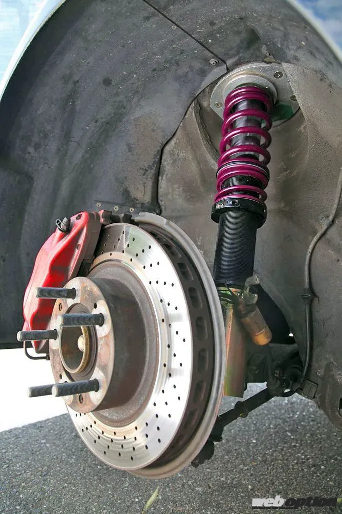 足回りは、アラゴスタをベースに独自のセッティングを施したペントルーフSPL車高調を装着。ブレーキは後期型となる964ターボ3.6の大容量キャリパー&ローターで強化される。