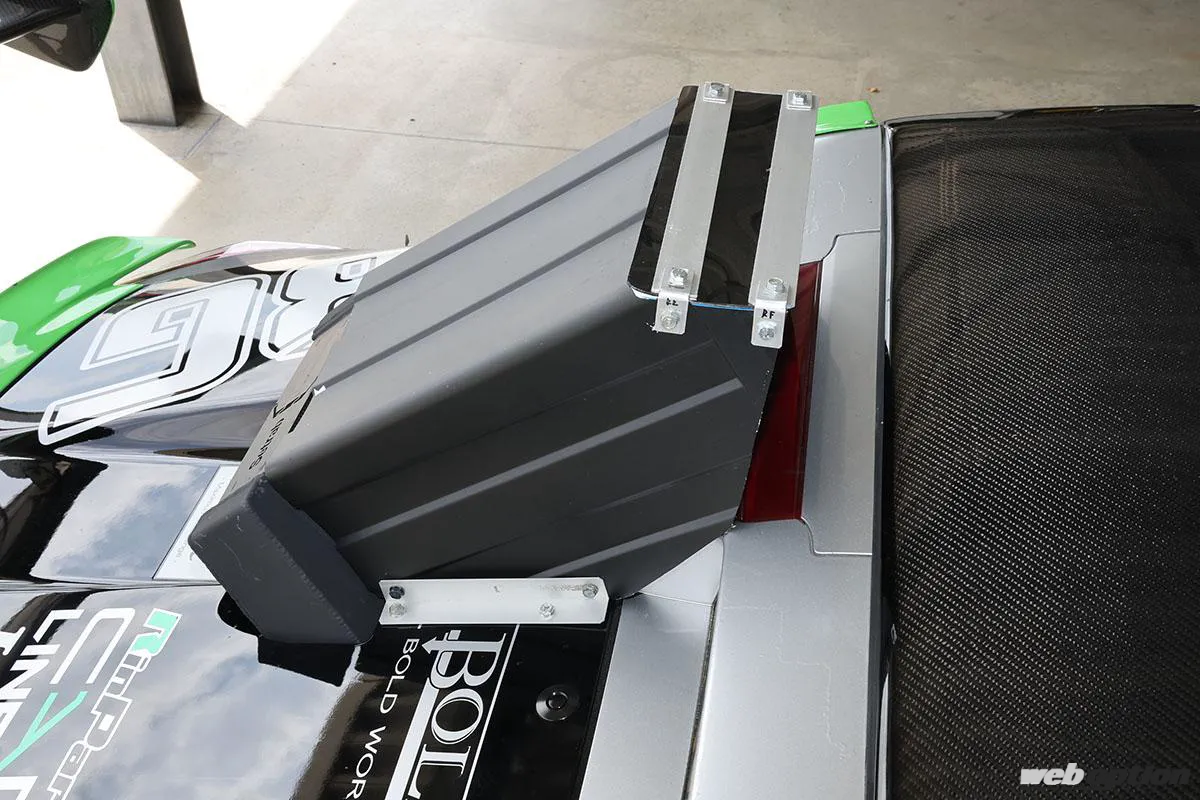 ちなみに、このエアシュノーケルは何とプラスチックのゴミ箱を加工して製作した即席のもの。このように速さに繋がるものなら何でも取り入れるスタンスで、ボディサイドの下面両脇にはホームセンターで入手した長いゴム板を追加。フロア下の空気をスムーズに流すなどテスト&トライを繰り返す。電動式フラップ付きのGTウイングもそのひとつ。ストレートではウイングを寝かせて高速コーナーで立てることで、限られたパワーを最大限に活かせるようにしているのだ。