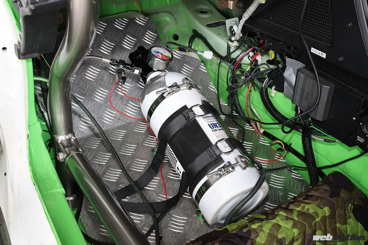 660cc仕様ではタービンの立ち上がりが悪く、中間トルクが不足するということで、それを補うためのNOSもセット。アクセル全開時、ステアリングに設けたスイッチを押せば50psが瞬時に上乗せされる。