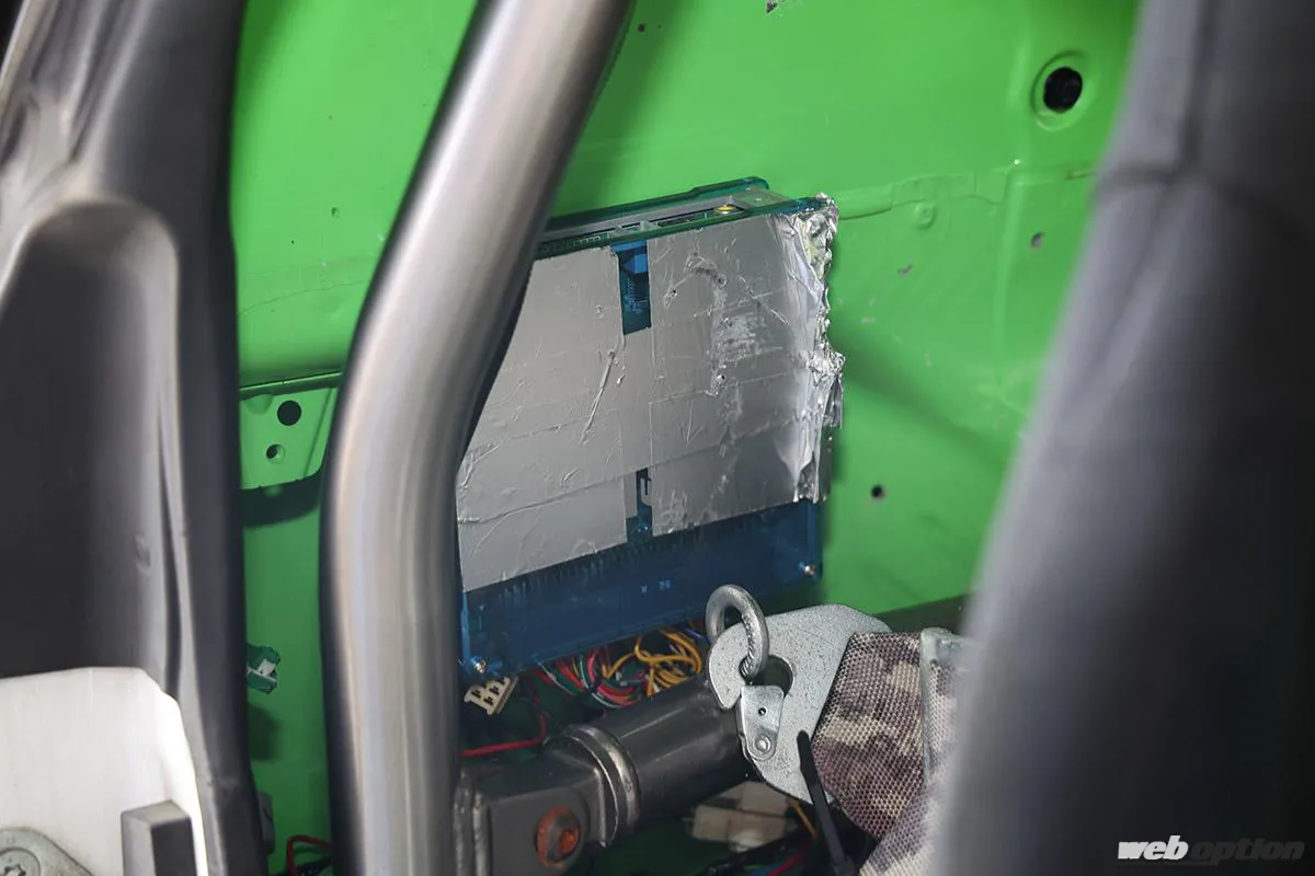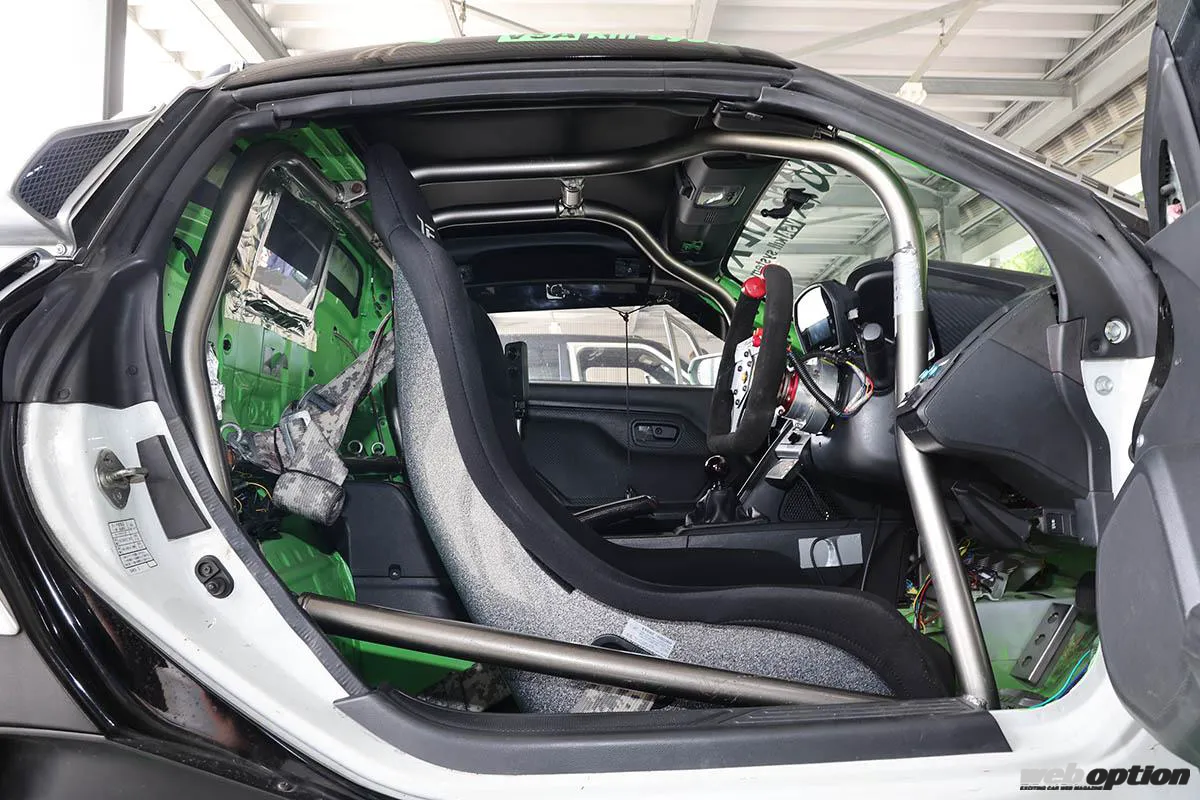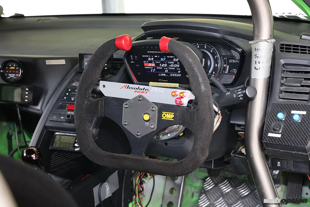 純正ドアパネルは、左右で約50kgと重いのでサイドビームを抜くなどして軽量化。その他、FRPパーツなどを駆使してシェイプアップを進めるも、ロールケージや補強パーツを追加しているため、車重は約800kgとノーマルよりは少し軽いくらいに留まっている。ちなみに、ステアリング上のスイッチはGTウイングを可変させるためのものだ。