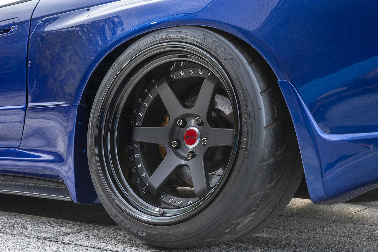 美しいホイールもアクティブオリジナルのRC-VIだ。現在のトレンドである“コンケイブ”と、改造車文化における伝統とも言うべき“深リム”を融合させ、新機軸の6本スポークを採用。ピアスボルトも取り入れるなど、斬新でありながらも落ち着いた雰囲気に仕上げられている。