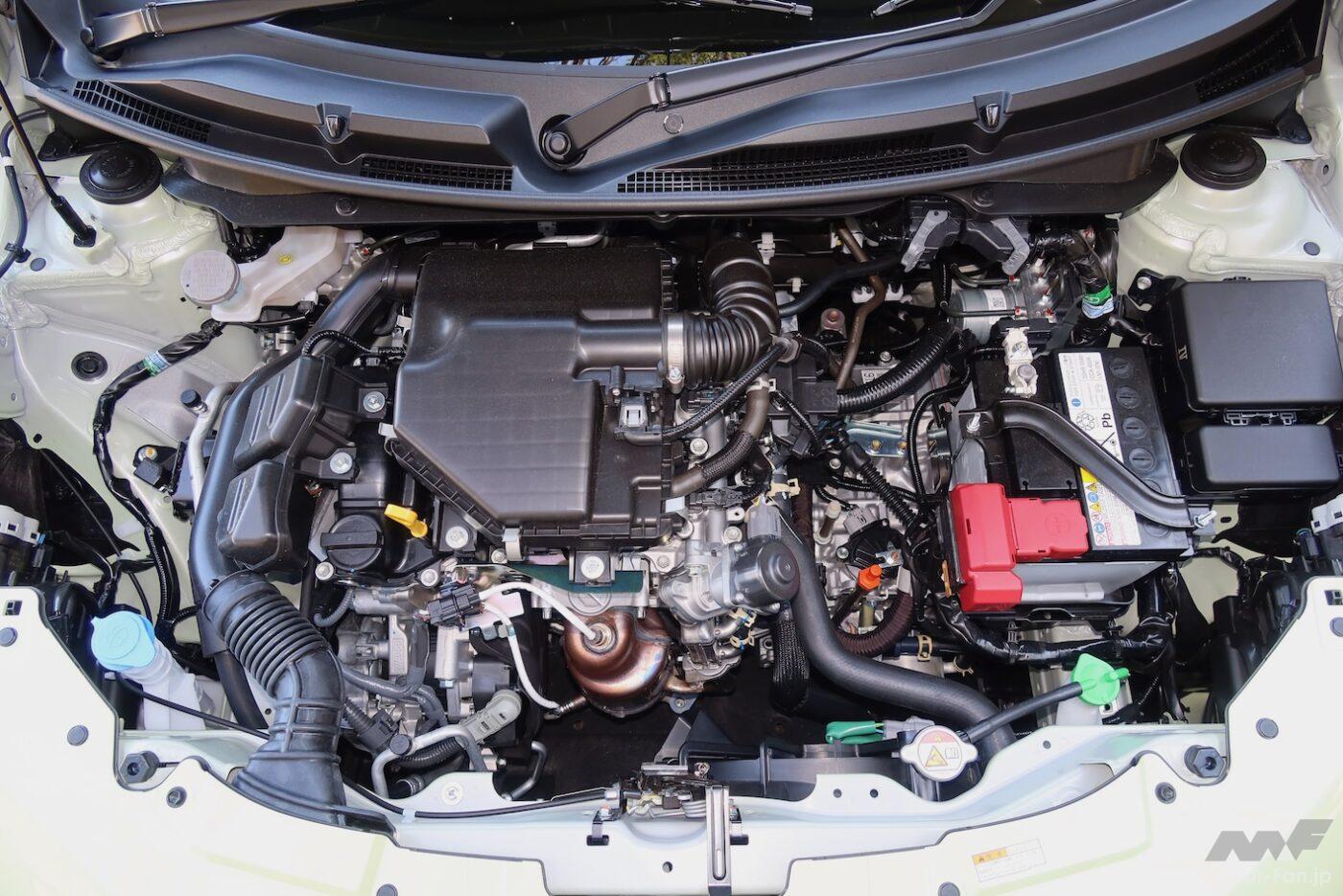 新設計したエンジンを適用したのは、燃費のためである。4気筒から3気筒に変えたのは、効率のためだ。ボア×ストロークは74.0×92.8mmで、ストローク/ボア比は1.25である。乱暴にいえば、4気筒→3気筒化で機械損失の低減を、ストローク/ボア比を大きくしたことで冷却損失の低減を図る狙い。吸気ポートはストレート化しつつ寝かせてタンブル(縦渦)を強くし、混合気を良く混ぜて燃焼改善を図る。