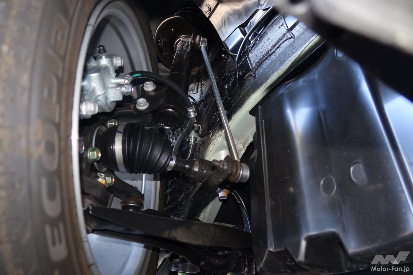 ダンパーの取り付け点を下げてストロークを伸ばすと同時に、バンプストッパーを新設計した。フロントも同様(2WDのみ)で、ゴム製だったものを発泡ウレタン製に変更しつつ長くした。リヤはもともとウレタン製だったが、これも長くした。フロント、リヤともに(ゴムに比べて)柔らかいウレタンを早めに当てて、突起乗り上げのような大きな入力があったときの当たりを柔らかくする狙い。