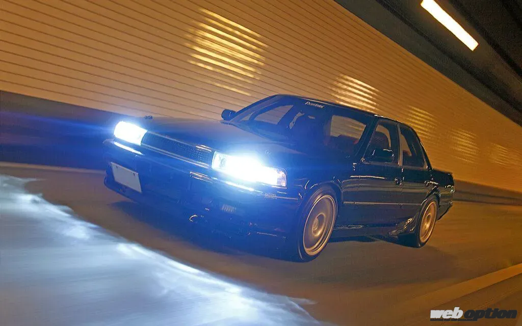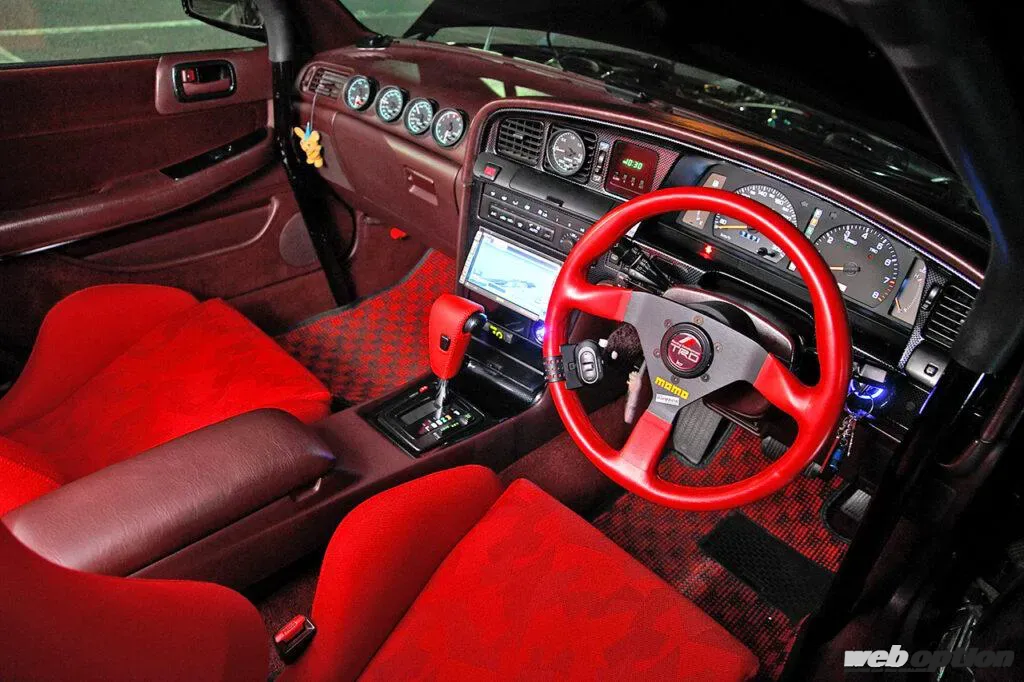 ボディは、光沢感のあるクラウン純正ブラックでオールペン。前後フェンダーはGT-Rサイズのホイールを収めるため、叩き出しによってワイド化されている。ちなみに、エアロにはBNR32リップスポイラーにA31サイドステップなど他車種用を流用して、さりげなく個性を演出している。