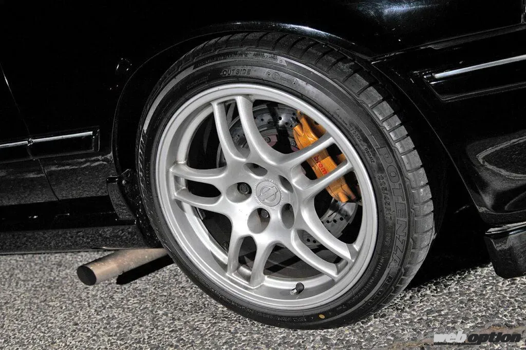 BCNR33純正ホイールにフロント225/45-17、リヤ235/45-17サイズのポテンザRE050Aをセット。足回りはエナペタル車高調で、スプリングレートはフロント10kg/mm、リヤ7kg/mm+ヘルパーとなる。