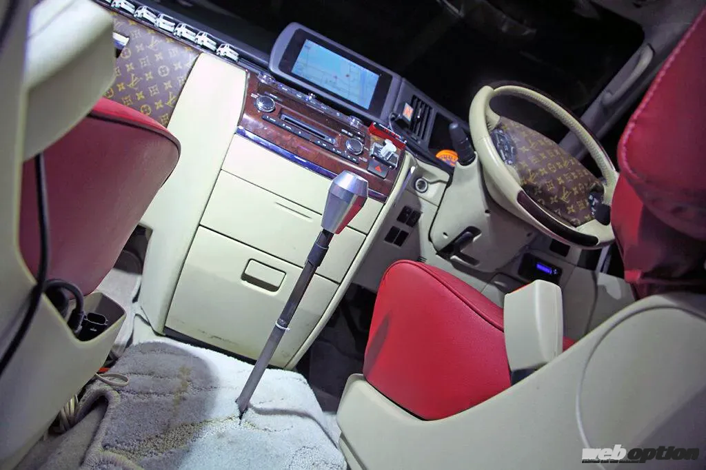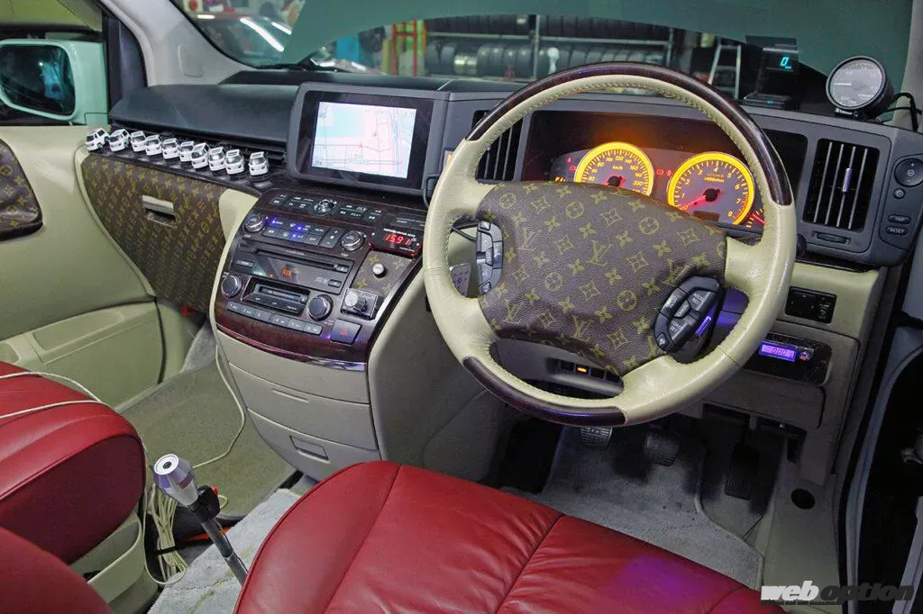 室内は各部をルイ・ヴィトンのモノグラム革で張り替えてドレスアップしつつ、ブースト計やコントローラーなども配備する。