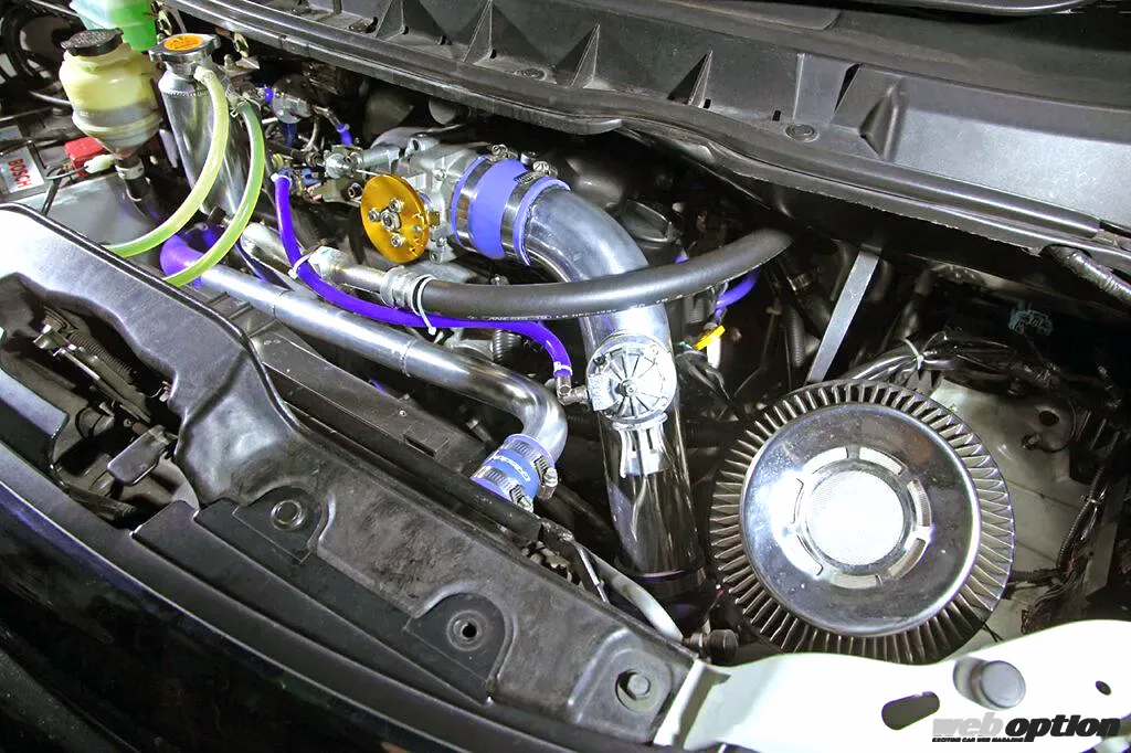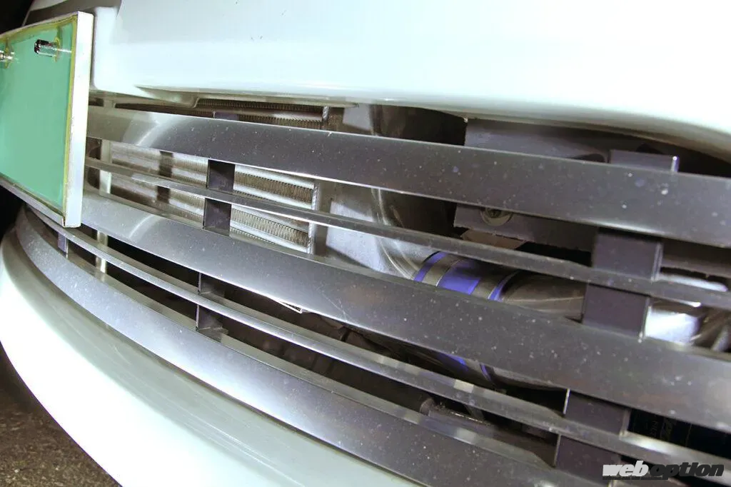 トラストの前置きインタークーラーは、ザウルスオリジナルの70φパイピングと合わせて装着。