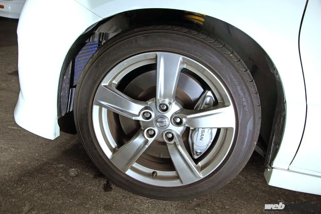 車高調はオーリンズDFV(F6kg/mm R4.2kg/mm)で、ブレーキはフロントにV35用4ポットキャリパーを移植。タイヤはアドバンスポーツ(FR225/35-18)となっている。ファイナルはフーガ用の4.1を組む。
