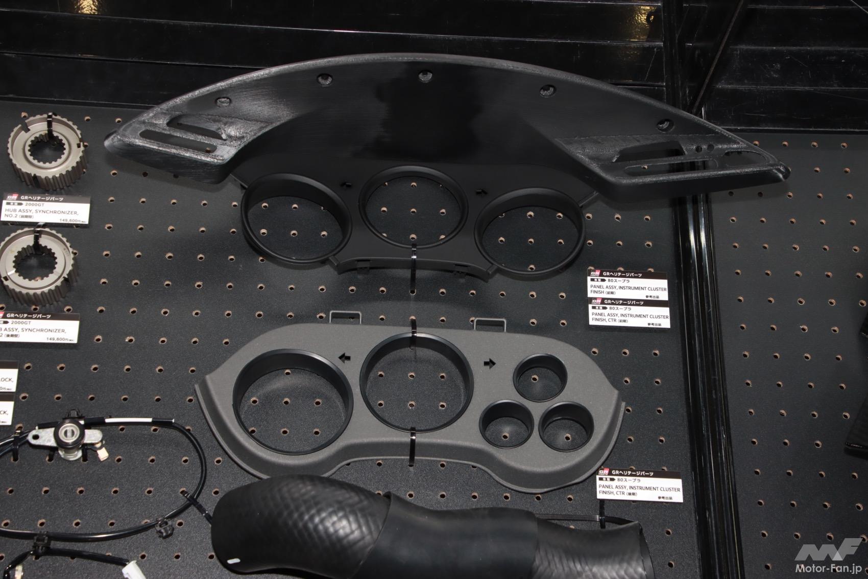 だが今回のオートサロンでは、80スープラの「PAD SUB-ASSY, INSTRUMENT PANEL SAFETY」(インパネ天面の合皮)、「PANEL ASSY, INSTRUMENT CLUSTER FINISH(前期)」(メーターユニットパネル上部のひさし部分)、「PANEL ASSY, INSTRUMENT CLUSTER FINISH, CTR(前期)」「同(後期)」(メーターユニットパネル中央のフィニッシャー。前期は丸型3連、後期は丸型5連)といった、車検の合否には直結しないインパネ関連の部品が、企画検討中あるいは開発中のものとして参考出品されていた。