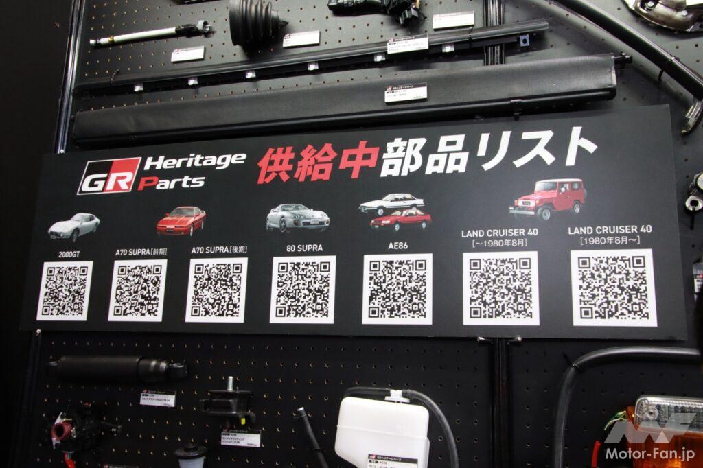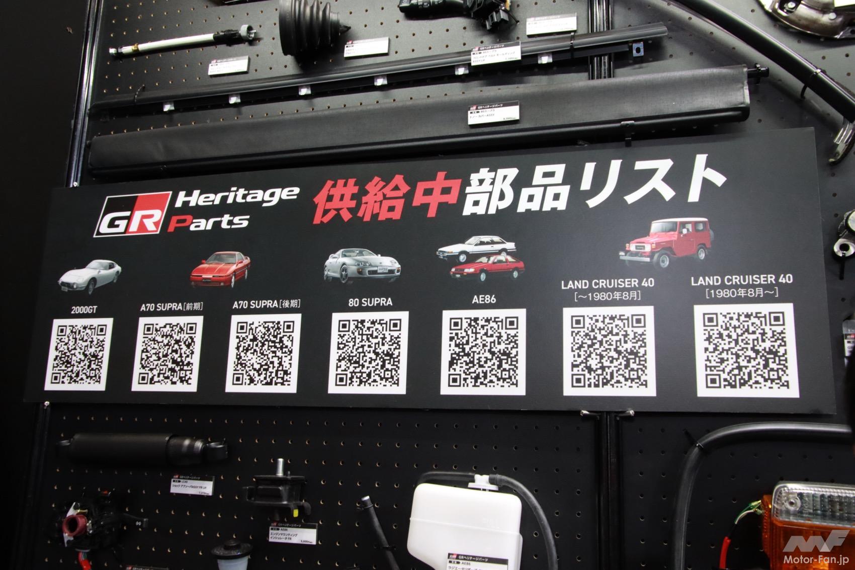 TOYOTA GAZOO Racingにより、2019年にプロジェクト発足が公表され、2020年より受注が開始された「GRヘリテージパーツ」は2024年1月時点で、40系ランドクルーザー、(1960〜1984年)、2000GT(1967〜1970年)、AE86型カローラレビン/スプリンタートレノ(1983〜1987年)、A70系スープラ(1986〜1993年)、A80系スープラ(1993〜2002年)の計5車種が展開されている。