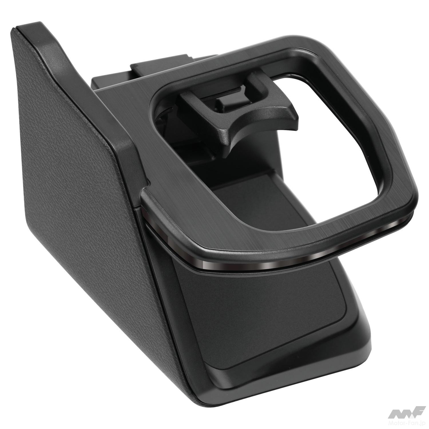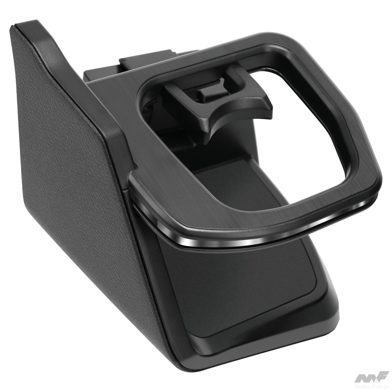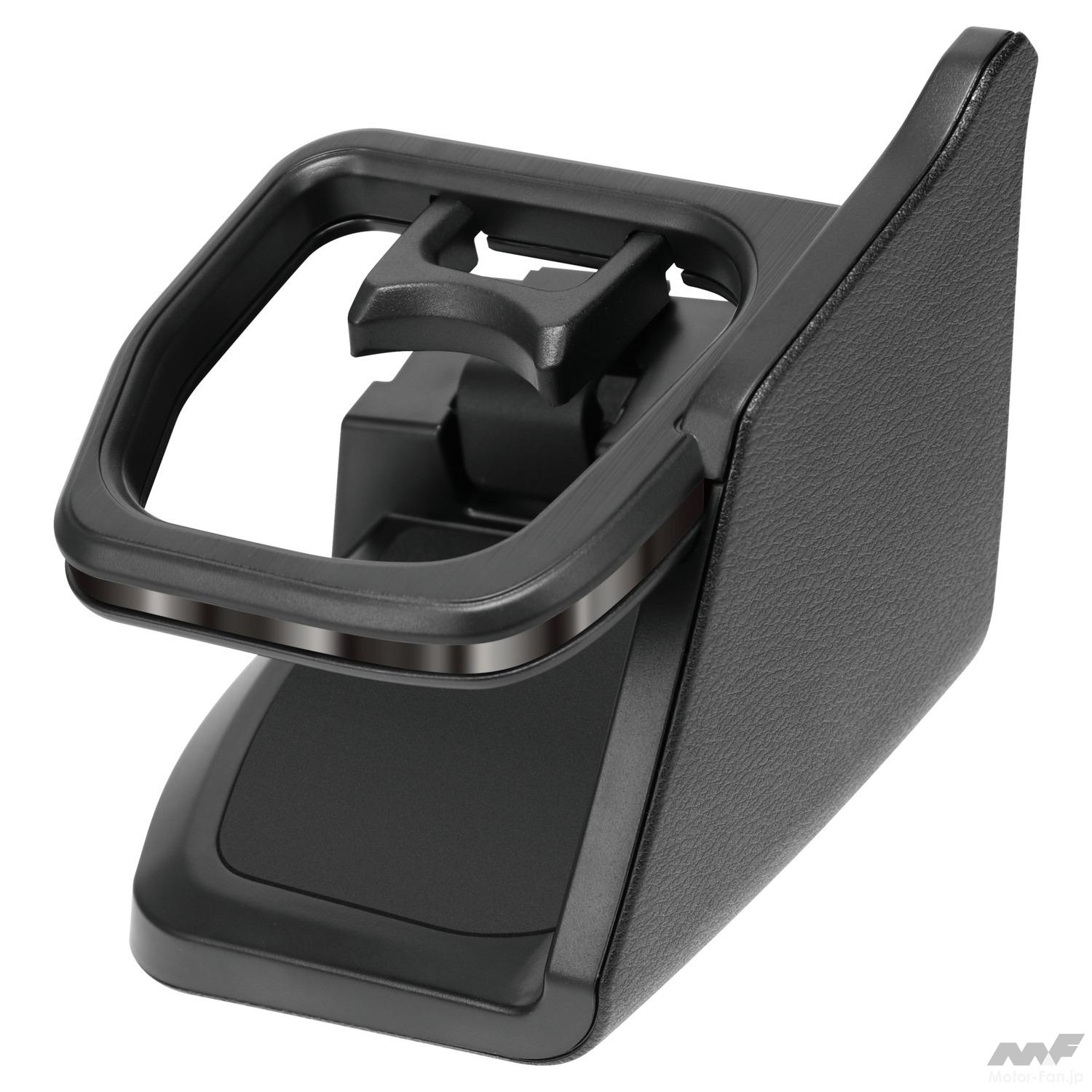 写真を見てのようにスタイリッシュなデザインで、形状は非対称。側面部分は内装とマッチするシボ加工が施されており、上面はドアスイッチパネルに合わせた仕上げとしている。市販カー用品にありがちな「後付け感」がなく、美しいフィッティングだ。もちろんウインカーレバーやその他スイッチ類に干渉する不具合もない。
