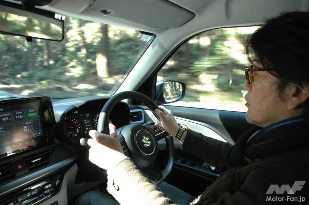 試乗車は、マイルドハイブリッドモデルの上級グレードとなる「HYBRID MZ」。パワーユニットは1.2L直列3気筒ターボ(82PS/108Nm)に直流モーター(3.1PS/60Nm)の組み合わせで、トランスミッションは今回CVTだったが、ハイブリッド「MX」(FWD)には5速MTも用意される。また試乗車の駆動方式はFWDだったが、フルタイム4WDも全グレードで選択可能だ(5速MT+4WDのみ設定なし)。