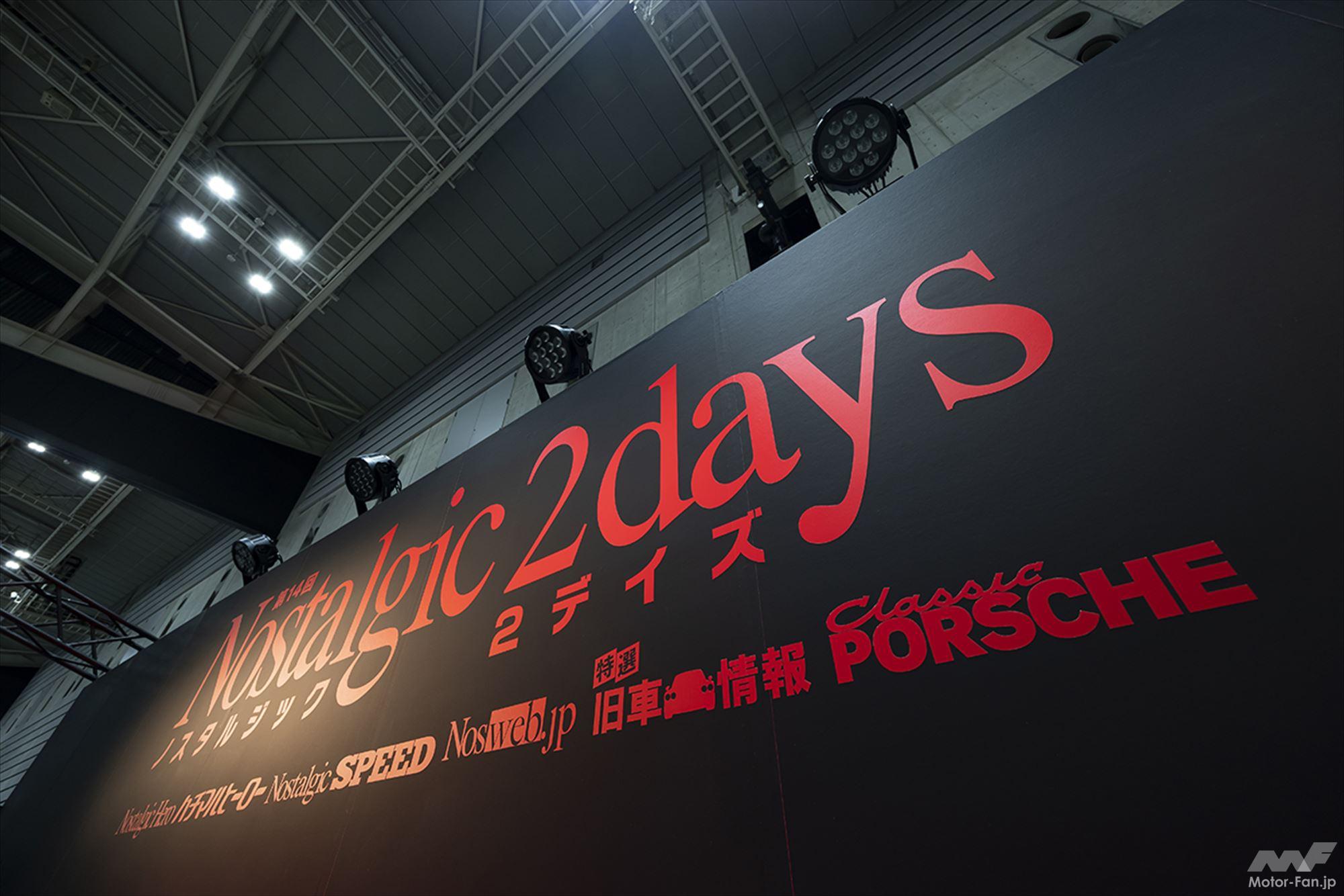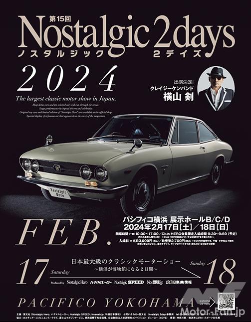 ■Nostalgic 2days 2024 主催:株式会社芸文社 Nostalgic 2days事務局 Produced by Nostalgic Hero、ハチマルヒーロー、Nostalgic SPEED、Classic PORSCHE、Nosweb.jp、特選旧車情報 会期:2024年2月17日(土)、18日(日) 時間:10:00 ~ 17:00(両日とも) 会場:パシフィコ横浜 展示ホール(B・C・D) 入場料:当日券3000円/前売券2700円(セブンイレブン、ローソン、楽天チケット、ライブポケットで販売) ※券1枚あたり500円の金券付き ※小学生以下は無料 後援:神奈川県/横浜市にぎわいスポーツ文化局 特別協力:公益財団法人横浜観光コンベンション・ビューロー イベント公式HP:https://nos2days.com/