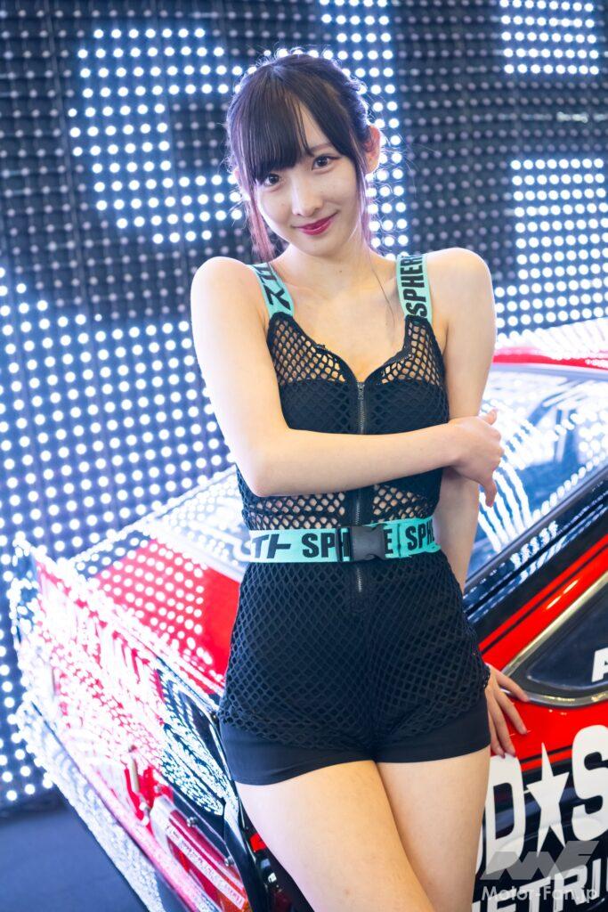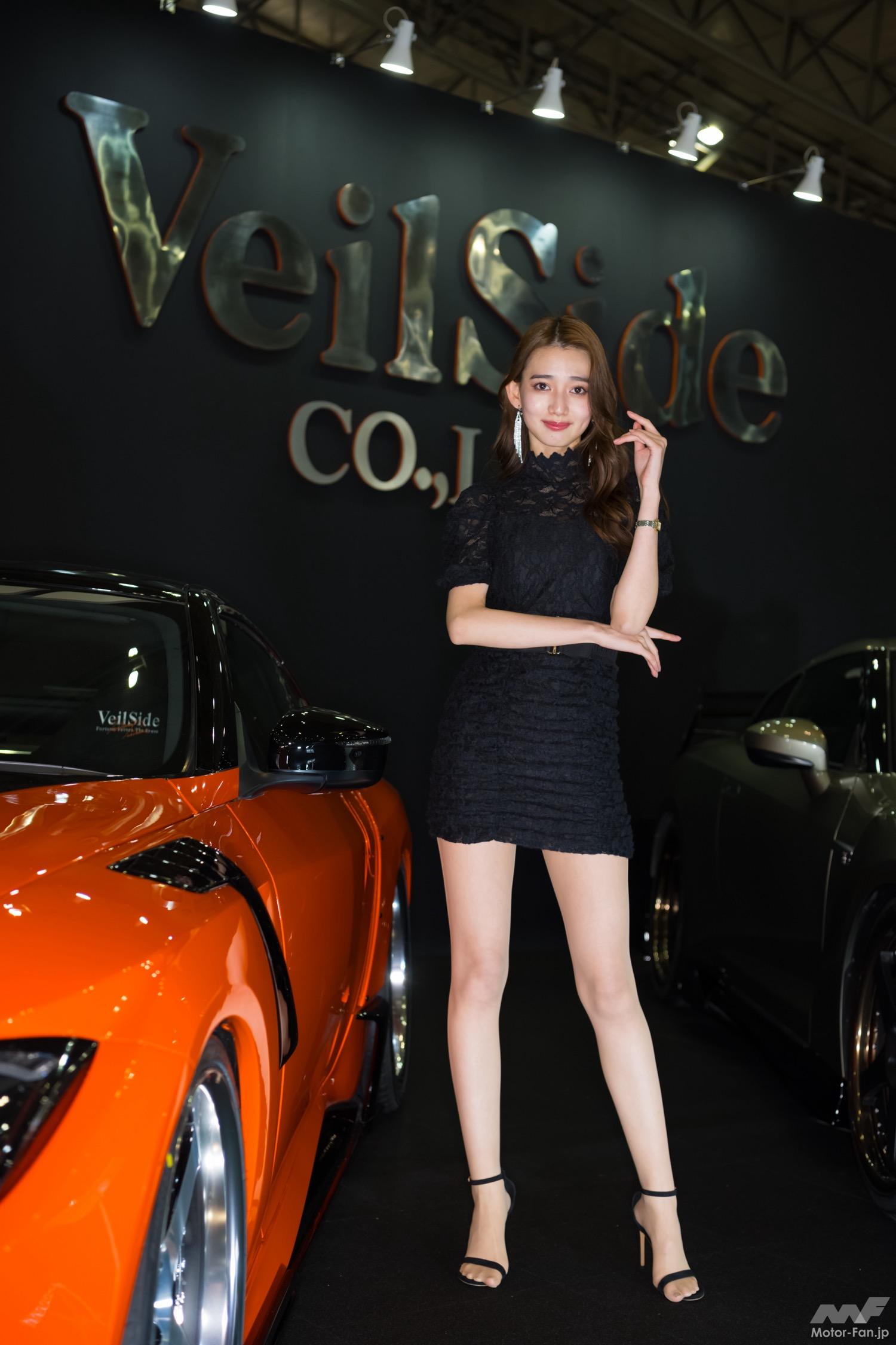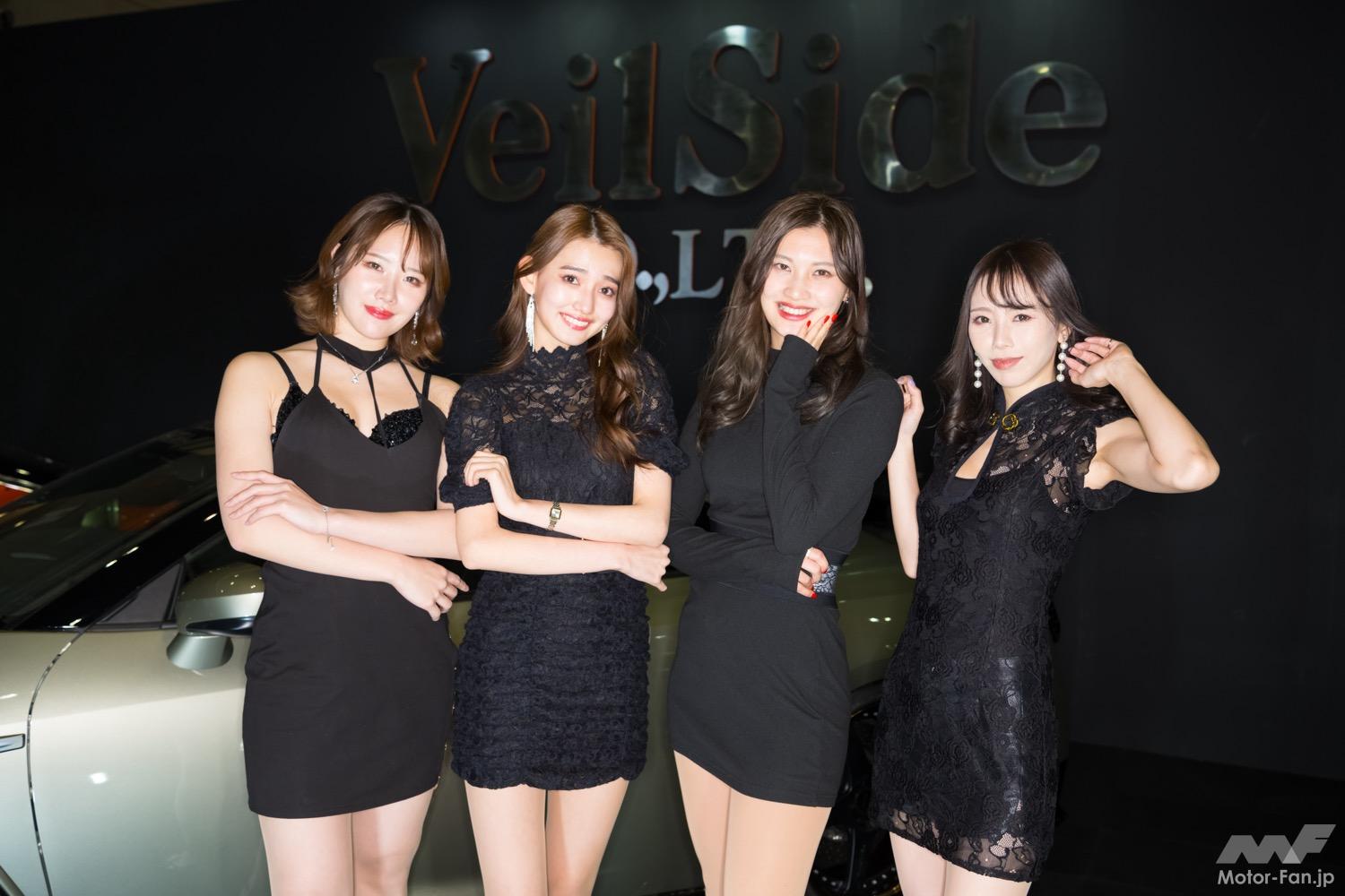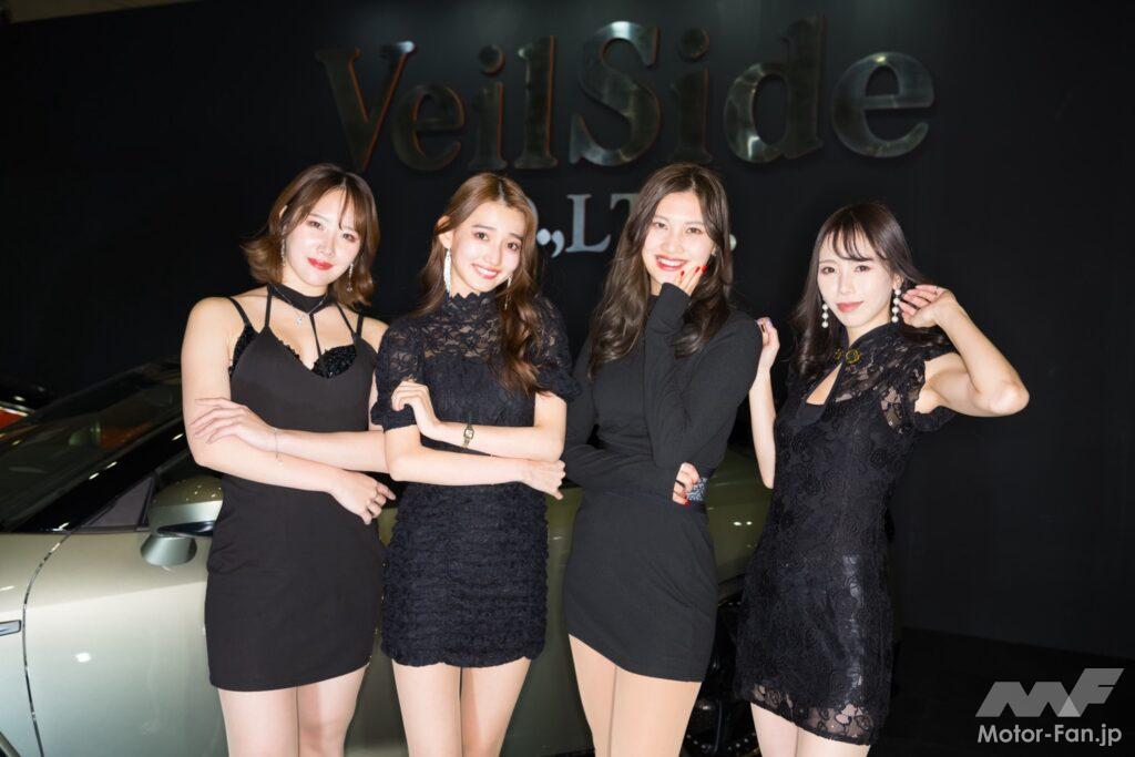 2024GTR、230セドリック、FFZ400の3台を出展したVeilSide。黒のミニワンピで着飾ったモデルたちが美脚を披露した。