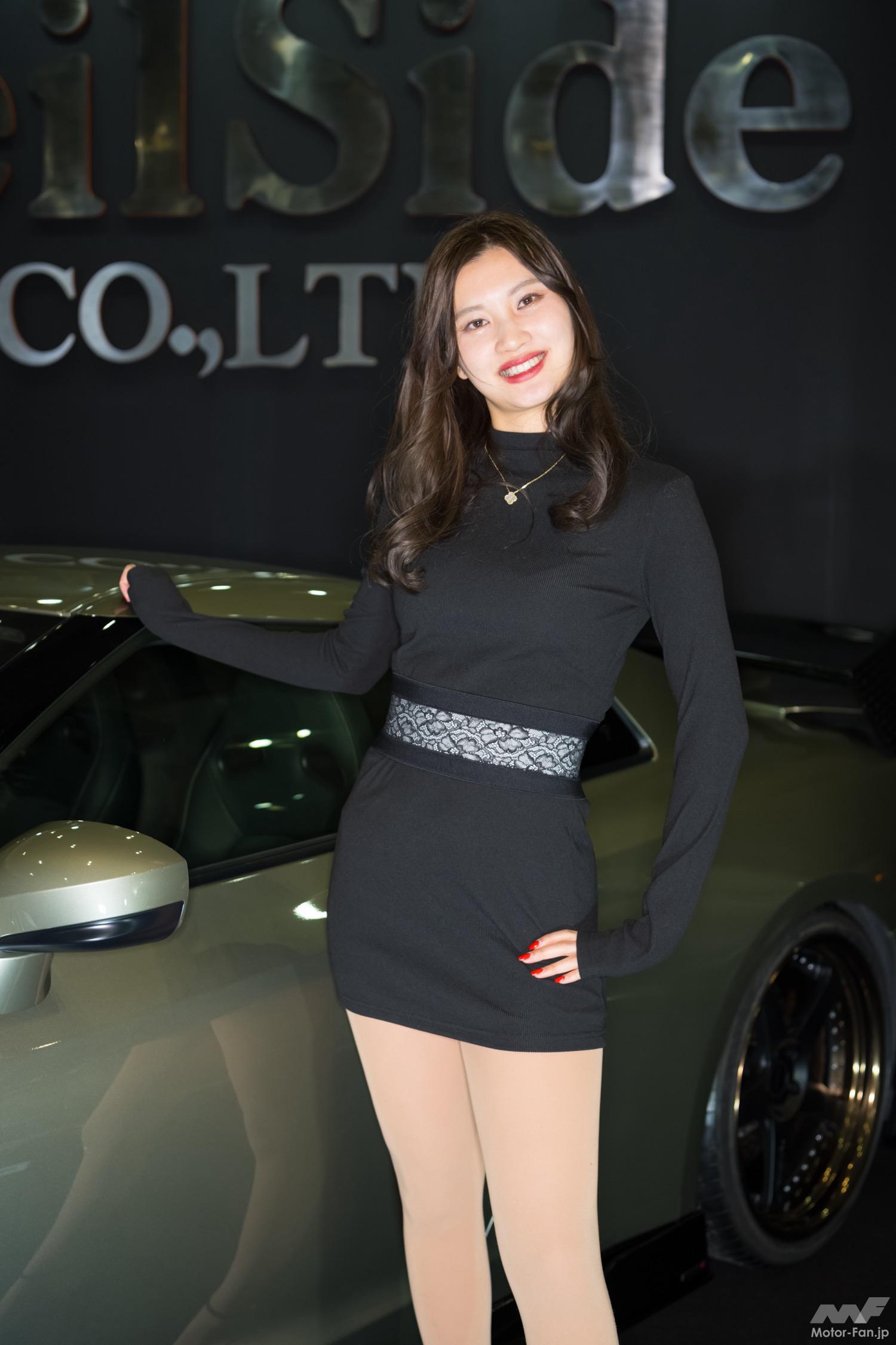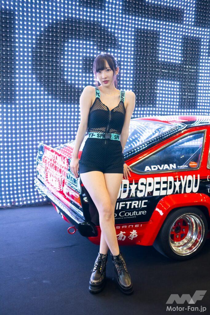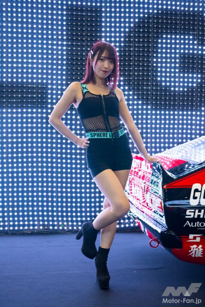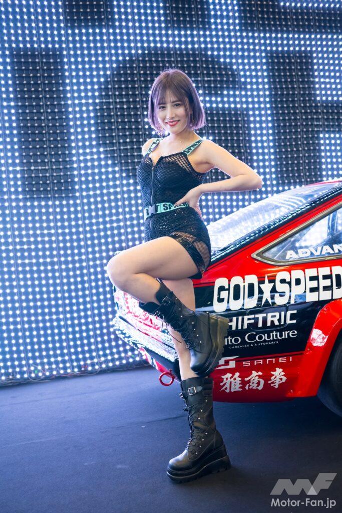 2024GTR、230セドリック、FFZ400の3台を出展したVeilSide。黒のミニワンピで着飾ったモデルたちが美脚を披露した。