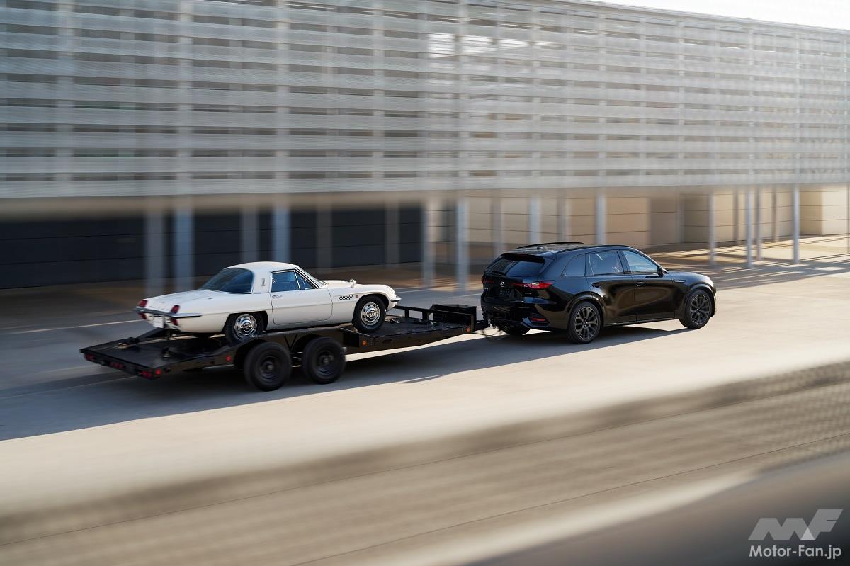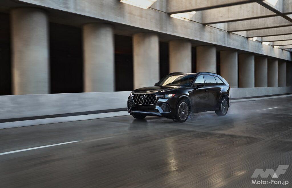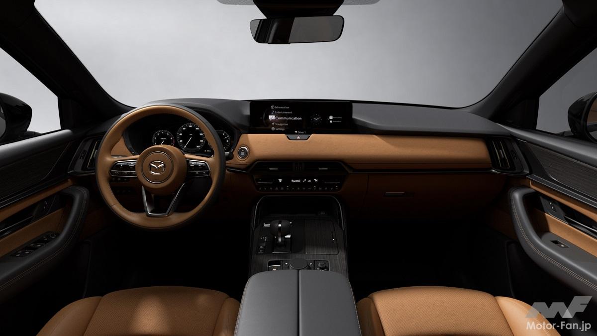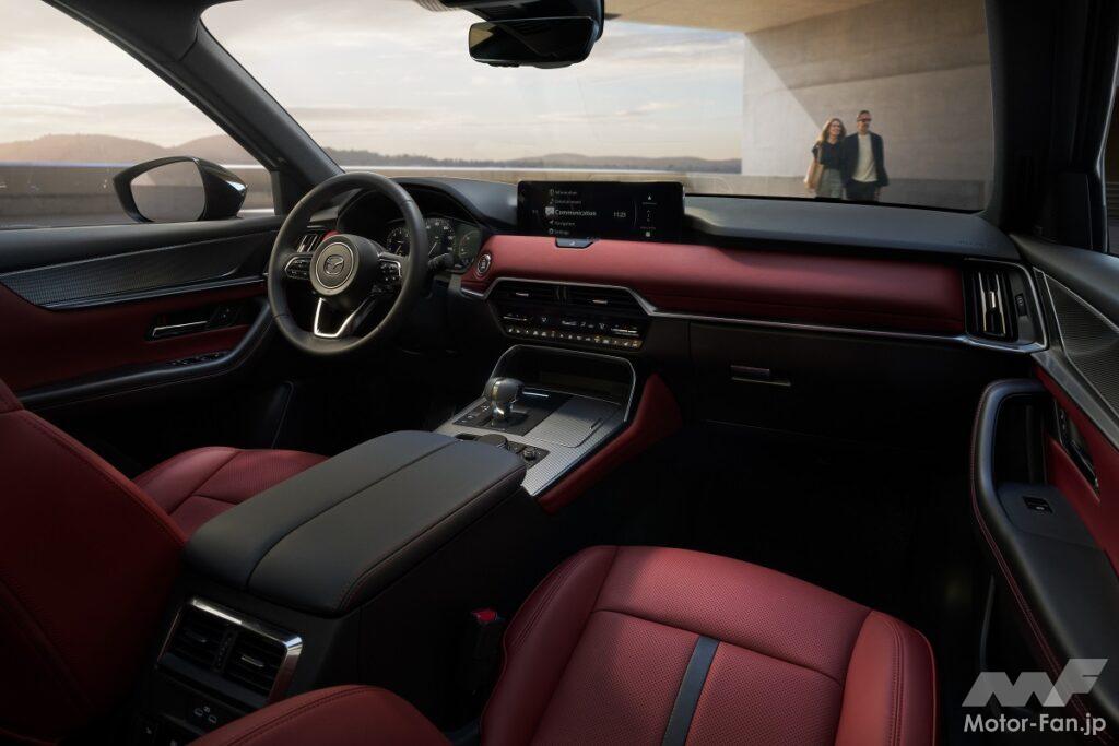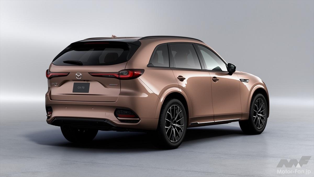 CX-70 PHEVプレミアムには、e-スカイアクティブ PHEVパワートレインを搭載し、17.8kWhのバッテリーパックを搭載した電気モーターと、2.5L自然吸気4気筒エンジンにより、最高出力323ps、最大トルク500Nmを発揮する。純電力走行で最大8.6kmの走行が可能で、最大23km/Lの燃費を実現している。走行モードは、「スポーツ」、「オフロード」、「ツーリング」、「EV」の4つのモードが設定されている。室内には、USB-Cポートが4つ設置され、さらにヘッドアップディスプレイを備えた12.3インチのフルデジタル・メータークラスターが装備される。ラゲッジスペースには、電化製品や機器への給電や充電が可能な1500Wの充電コンセントが標準装備されている。
